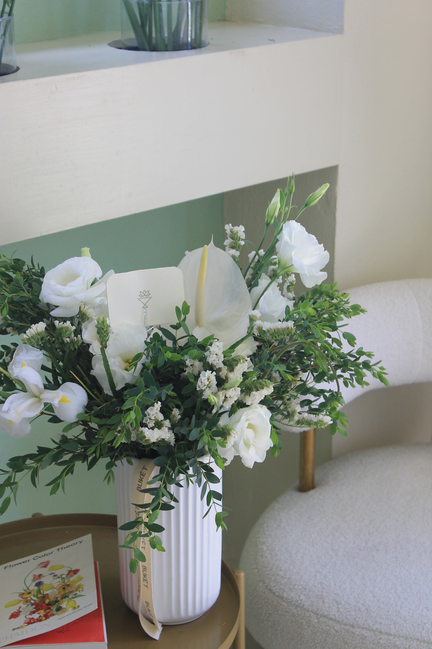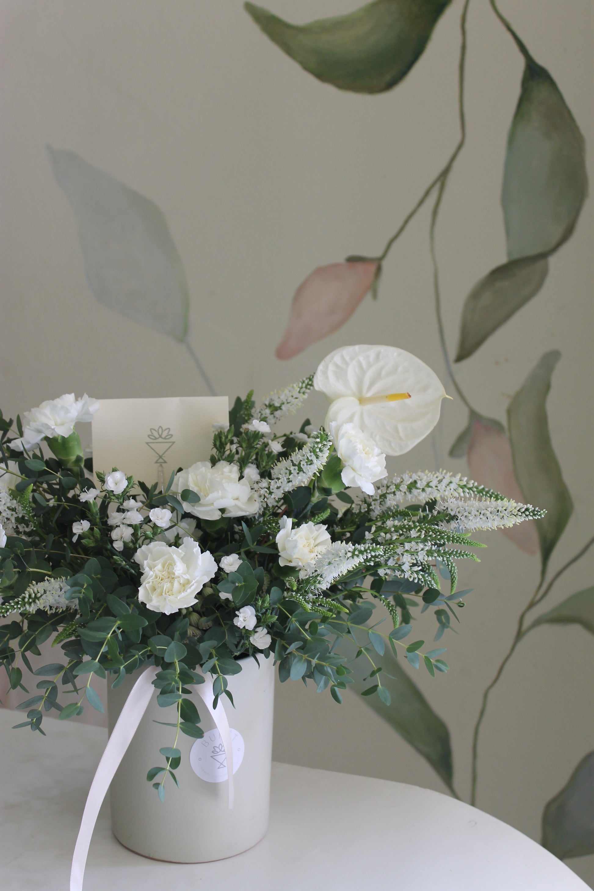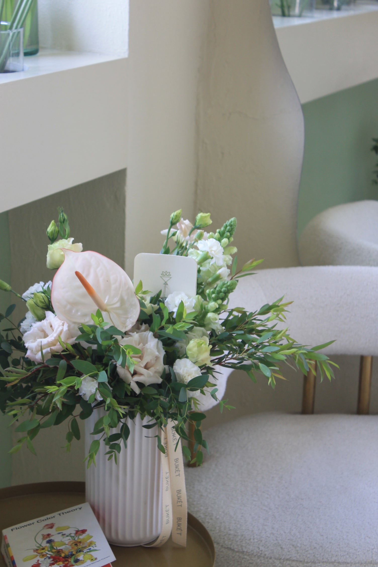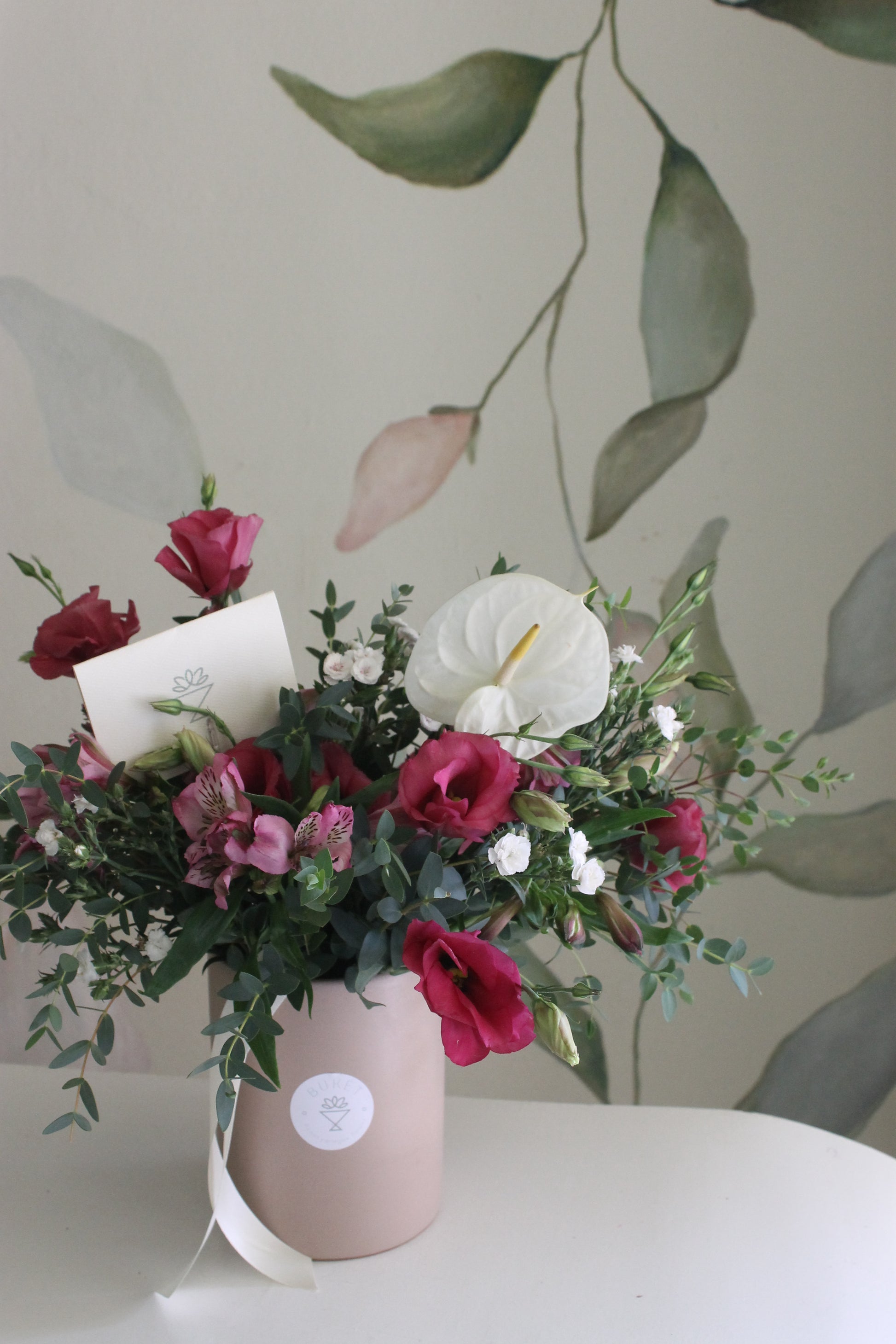 Arreglo con follaje eucalipto de base con de flores complementarias y un anturio como toque especial. ¡Puedes elegir tus tonalidades favoritas!