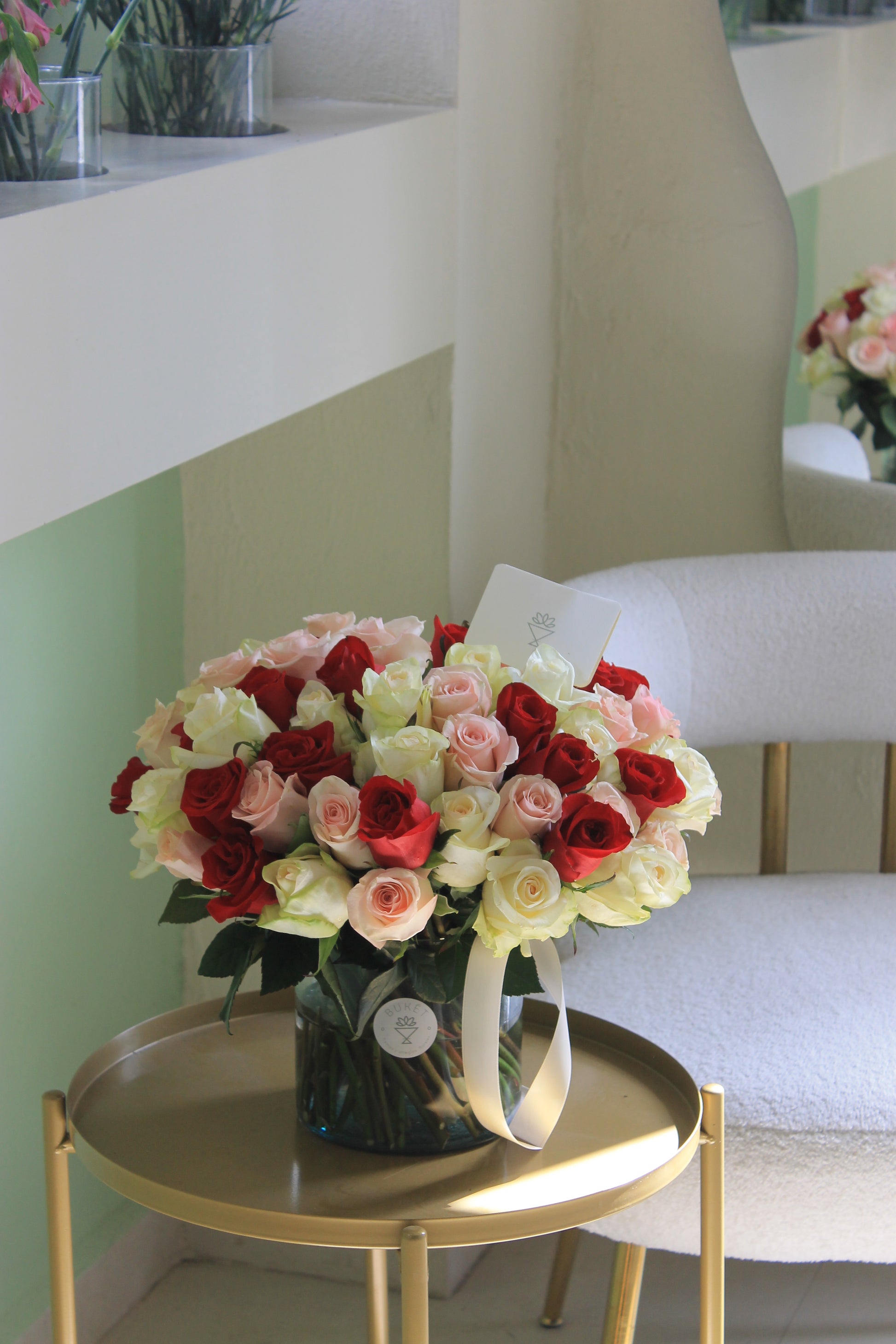cilindro de cristal con 100 rosas (se pueden elegir máximo 4 tonos)
