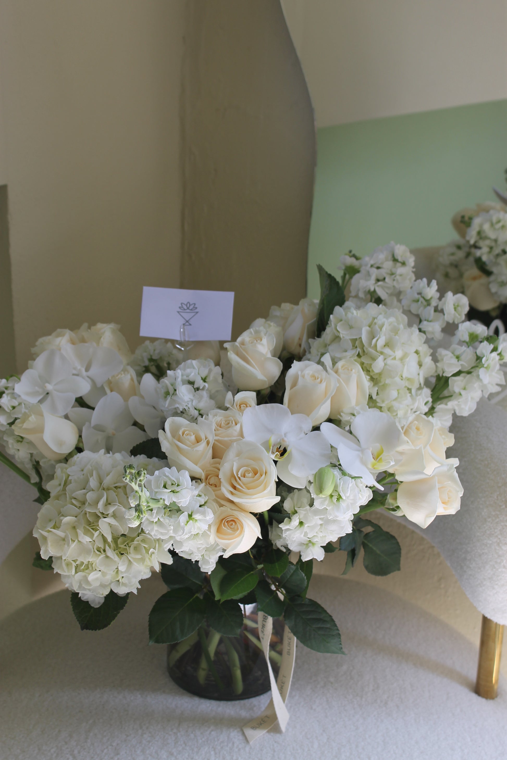 Arreglo con una combinación de flores premium en color blanco (hortensias, rosas, mathiola, orquídea)