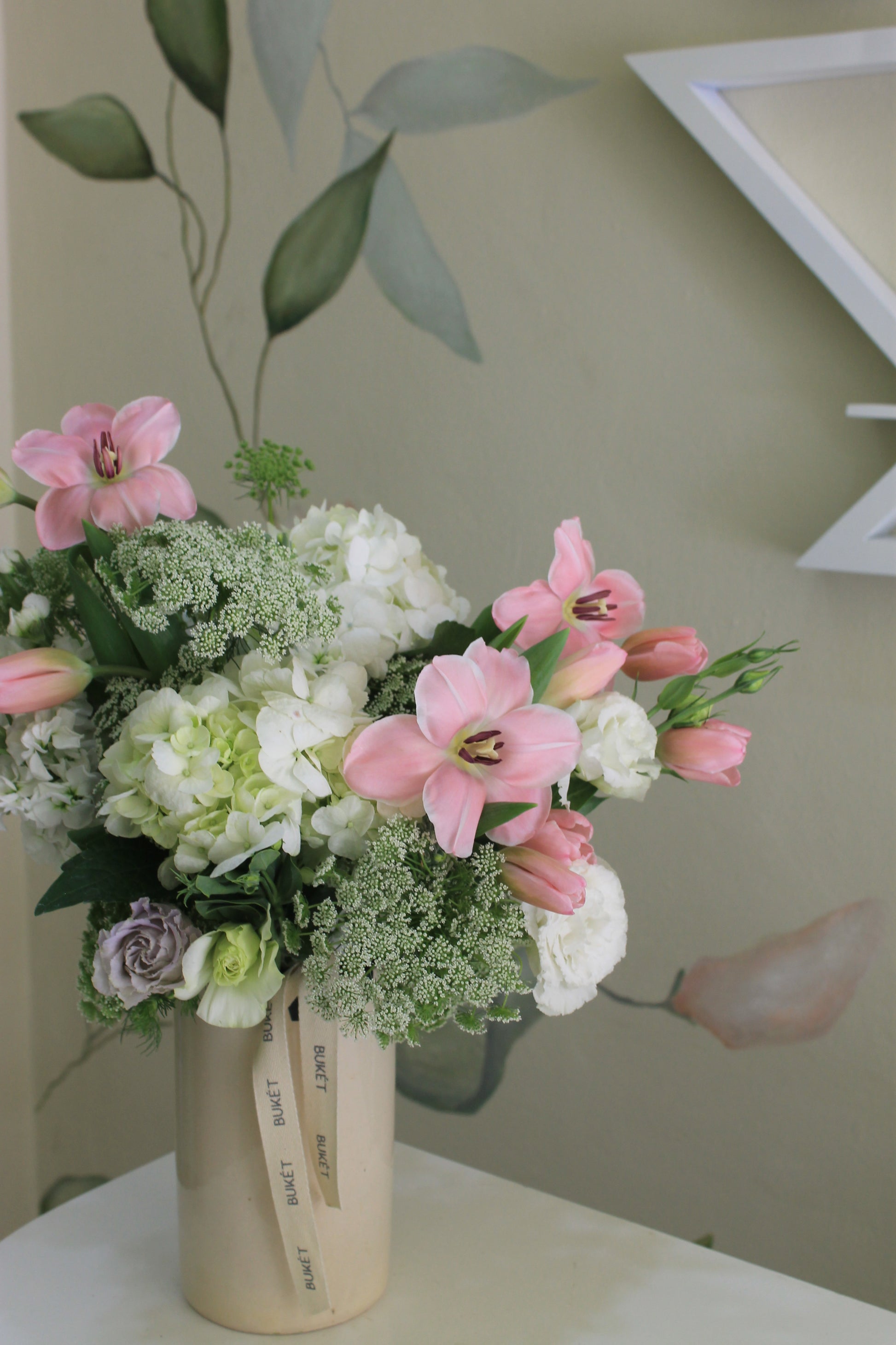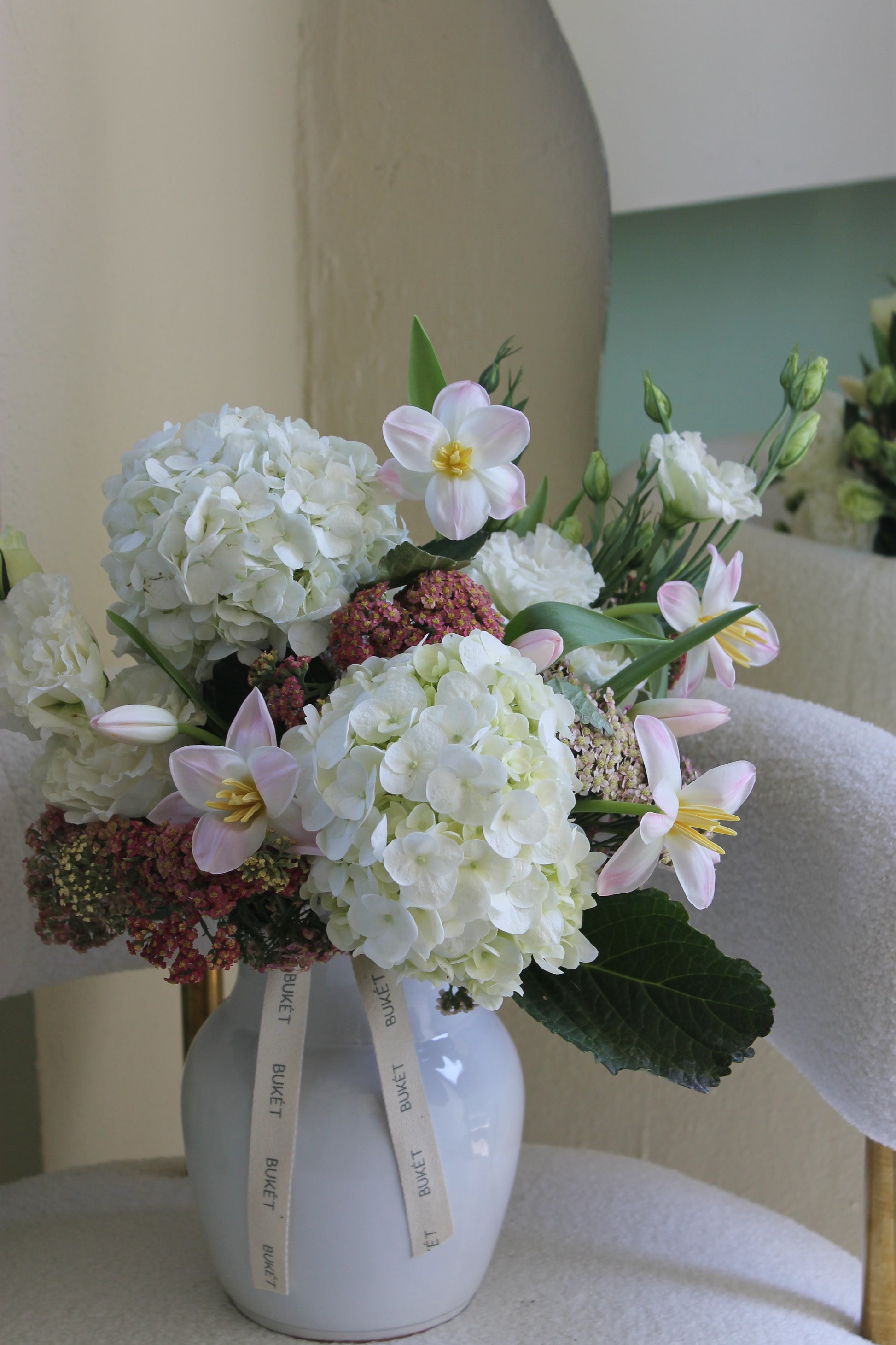 Arreglo con hortensias y tulipanes como flores principales + follaje y flores complementarias