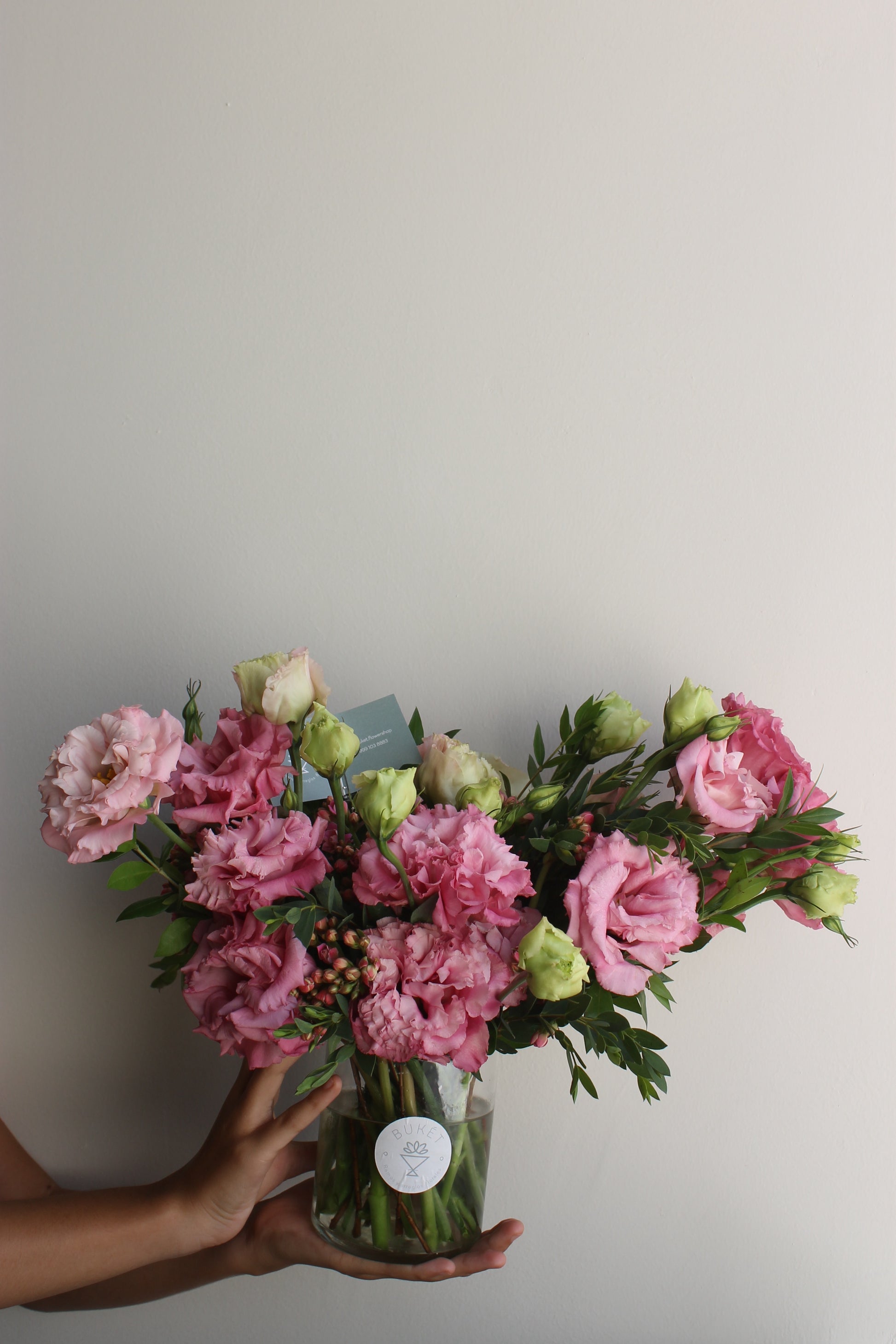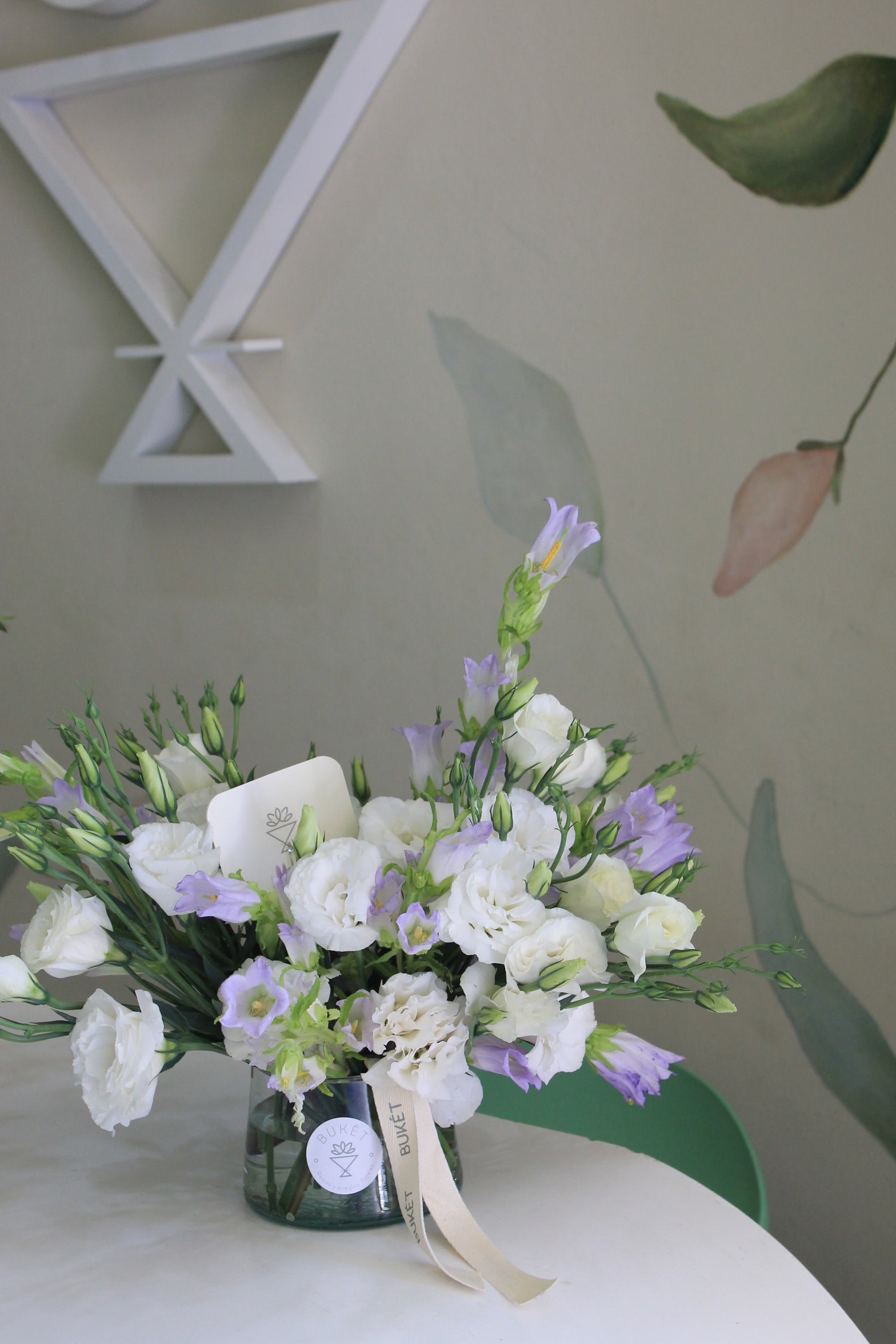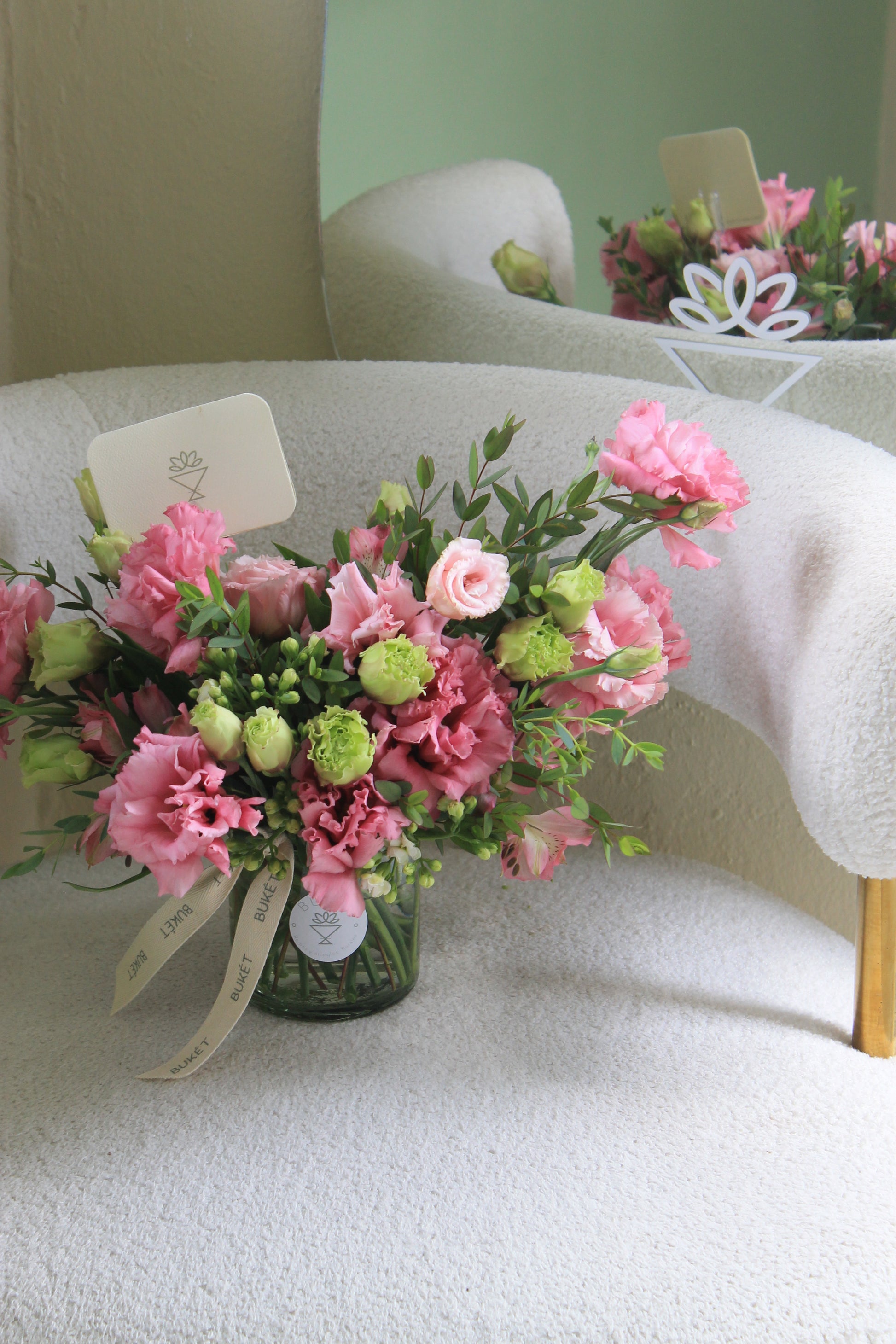 Arreglo de lisianthus, kalanchoe y follaje complementario.
