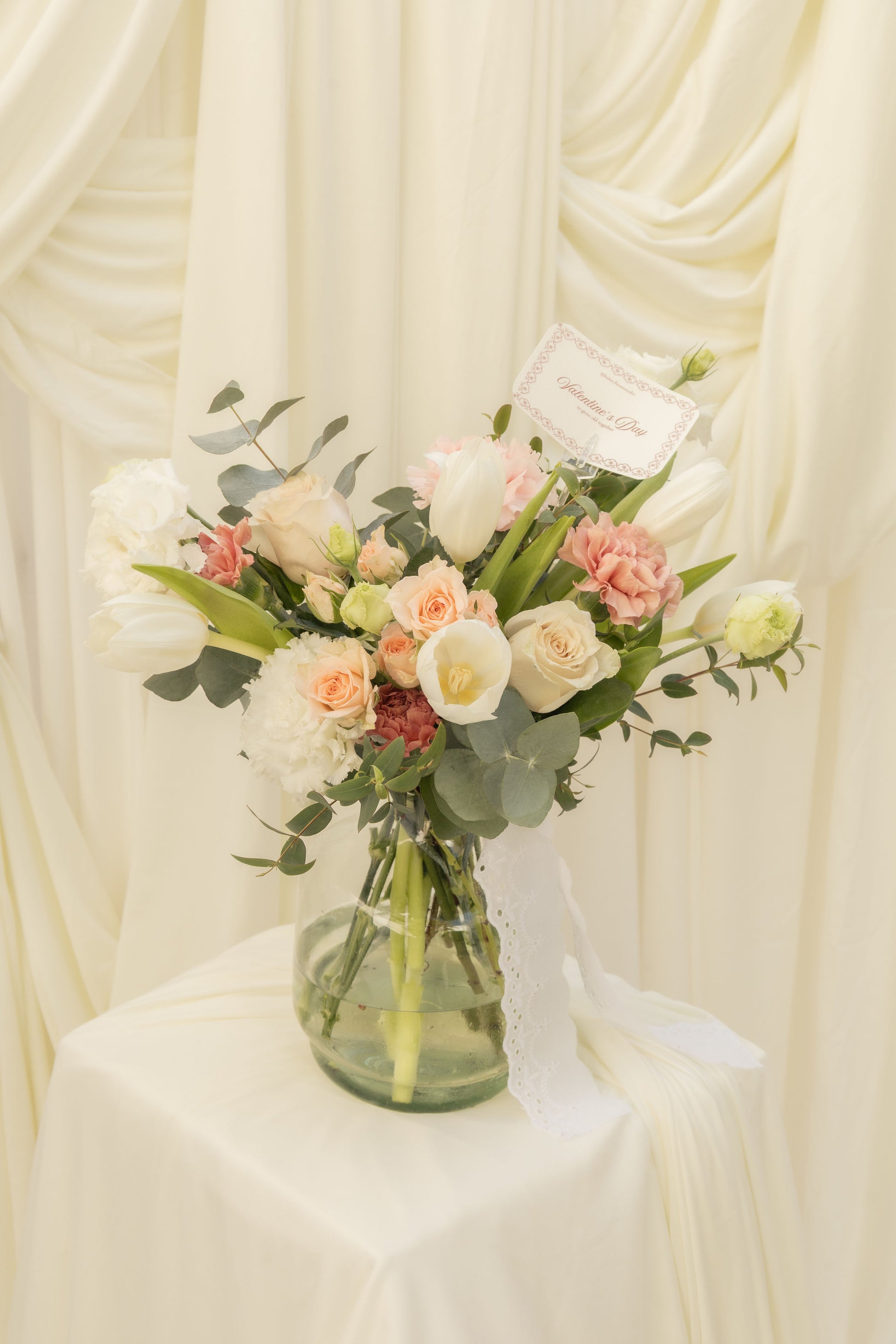 Un arreglo espectacular!! con una selección de flores en tonos pasteles. Tulipanes, rosas, lisianthus, mini rosas y clavel.