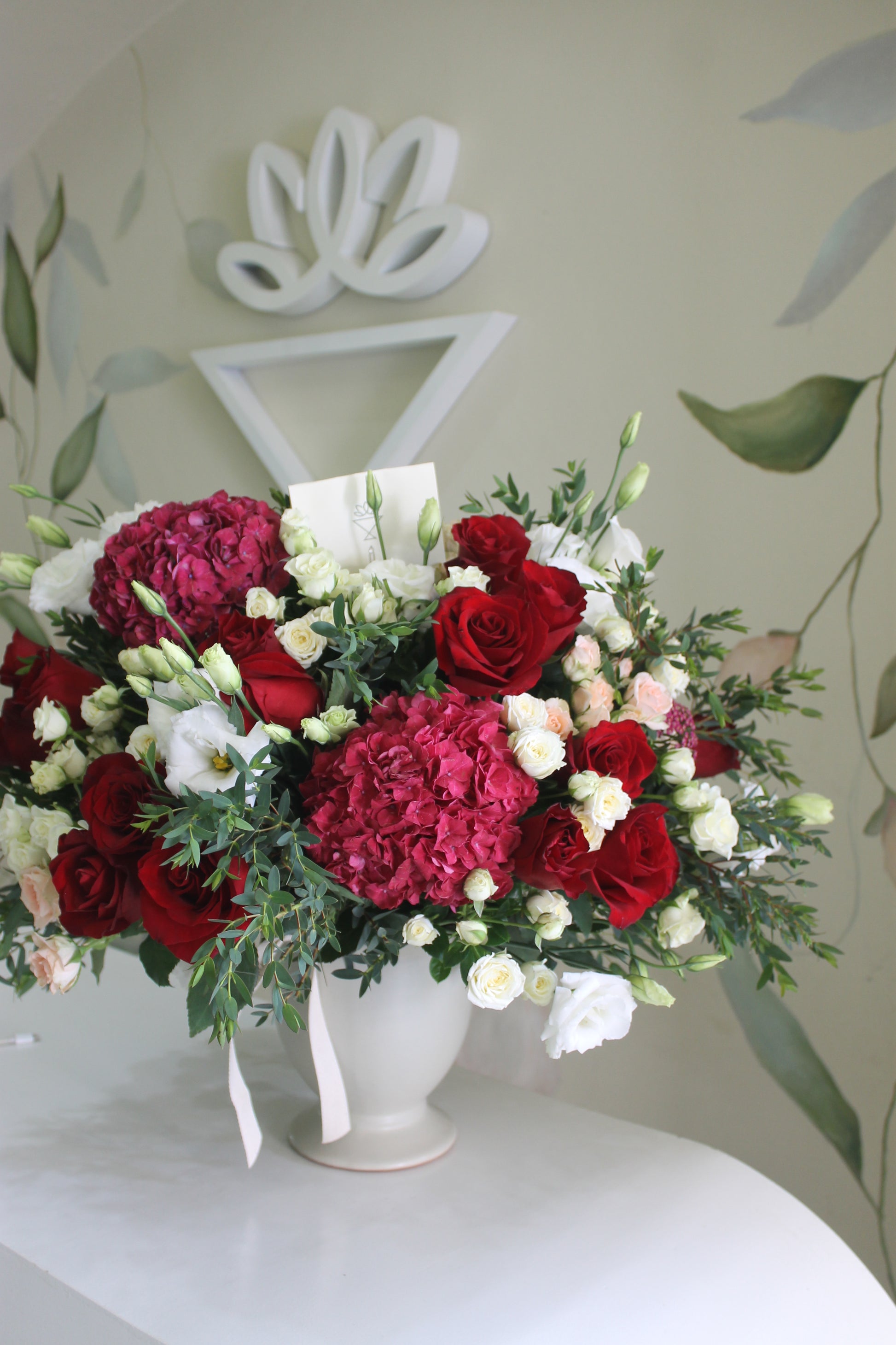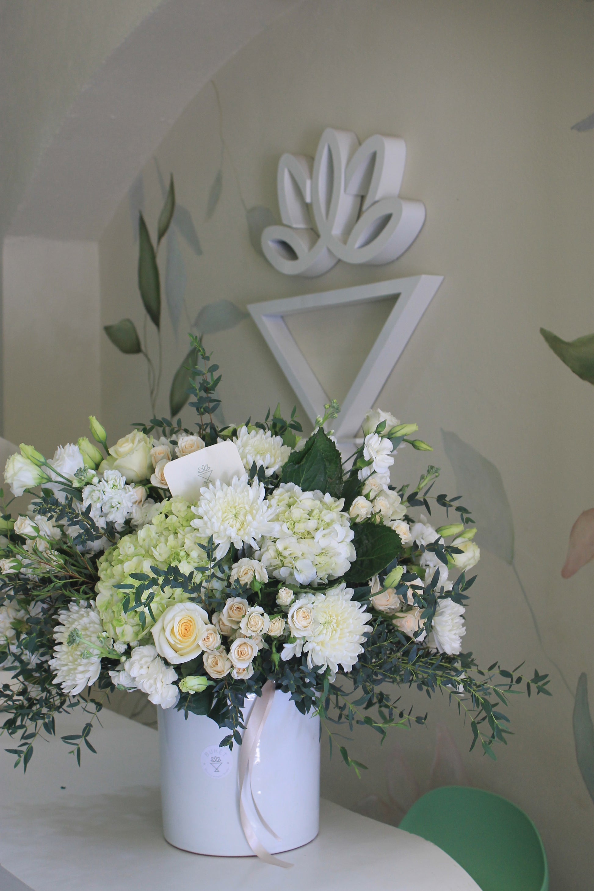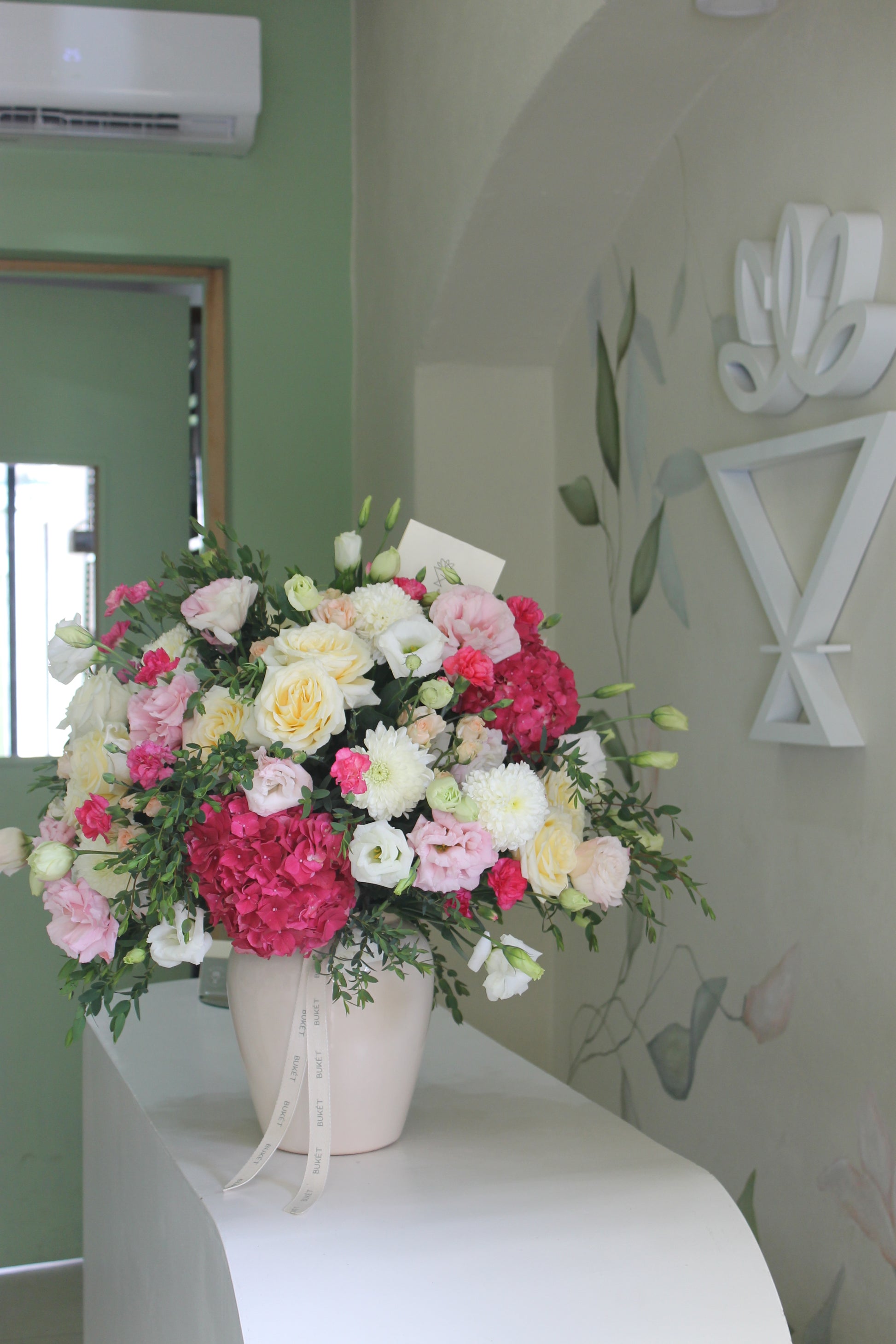 Margaritas, mini rosas, hortensias, lisianthus, follaje y flores complementarias