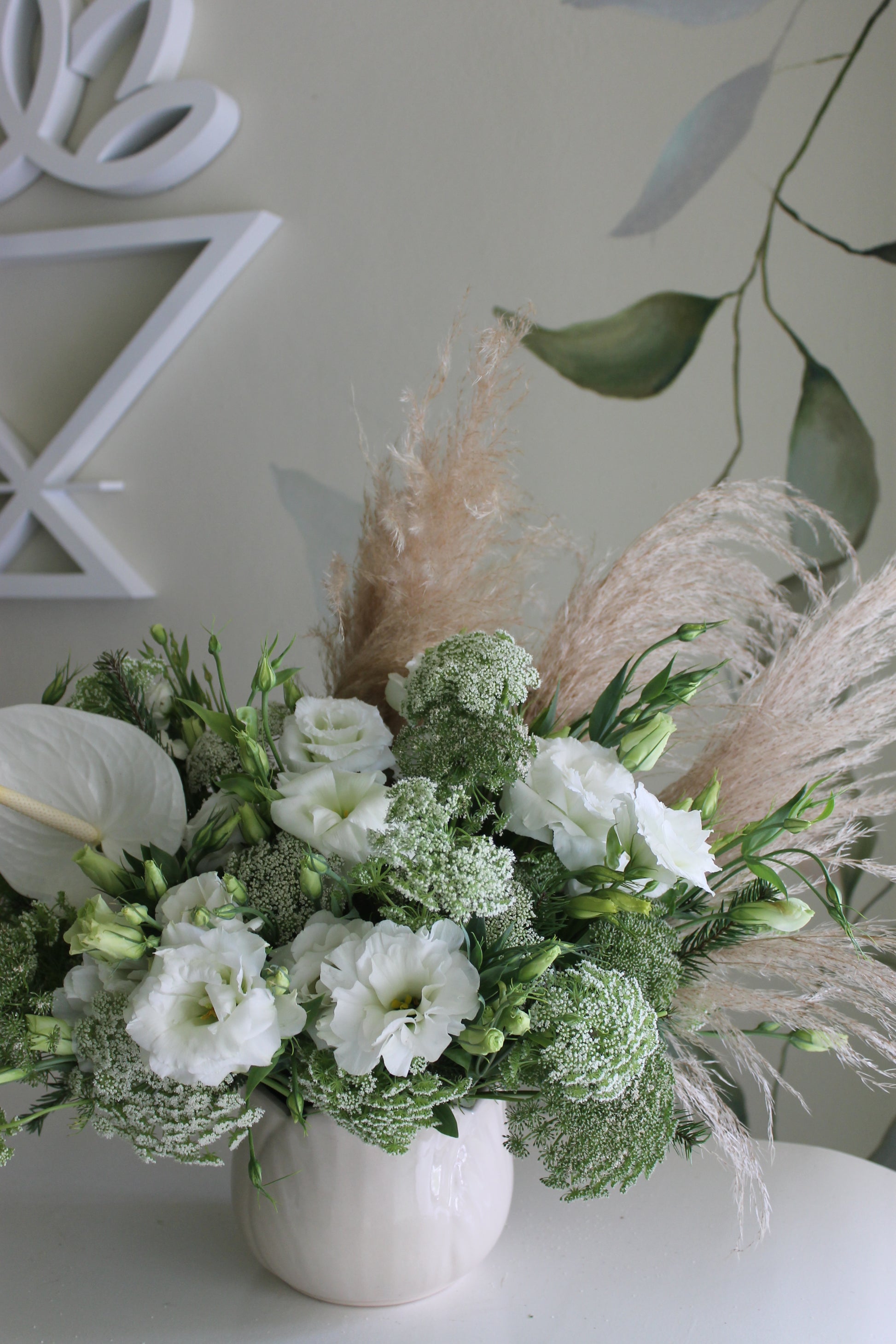 Arreglo con rosas, lisianthus y pampas Grass, especial para una bride to be única y diferente