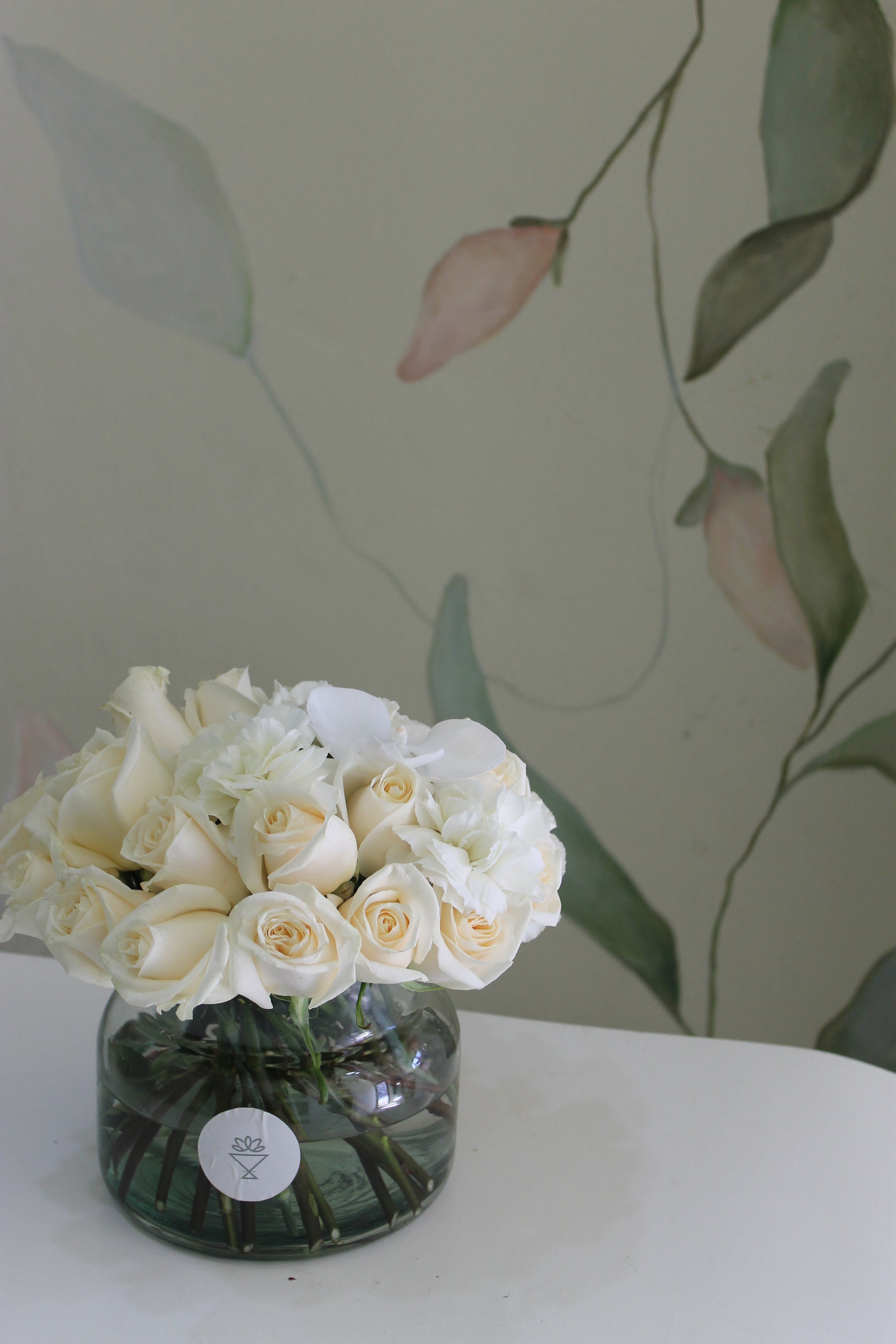 Arreglo con 24 rosas y flores de orquídea, especial para una bride to be elegante y clásica.