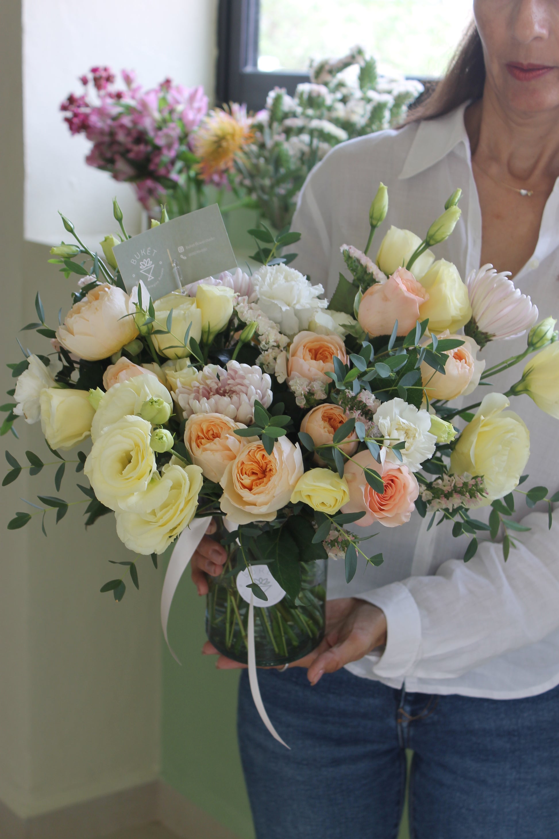 Arreglo con rosas inglesas, margaritas, lisianthus, follaje y flores complementarias