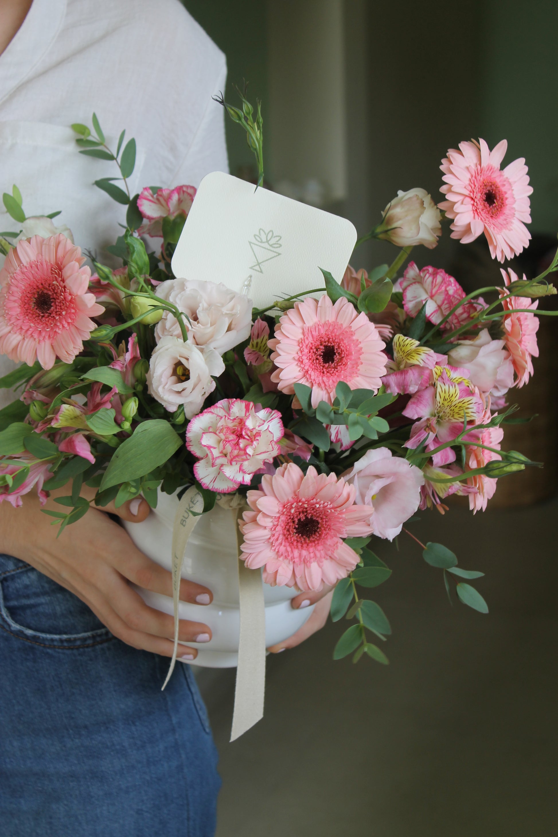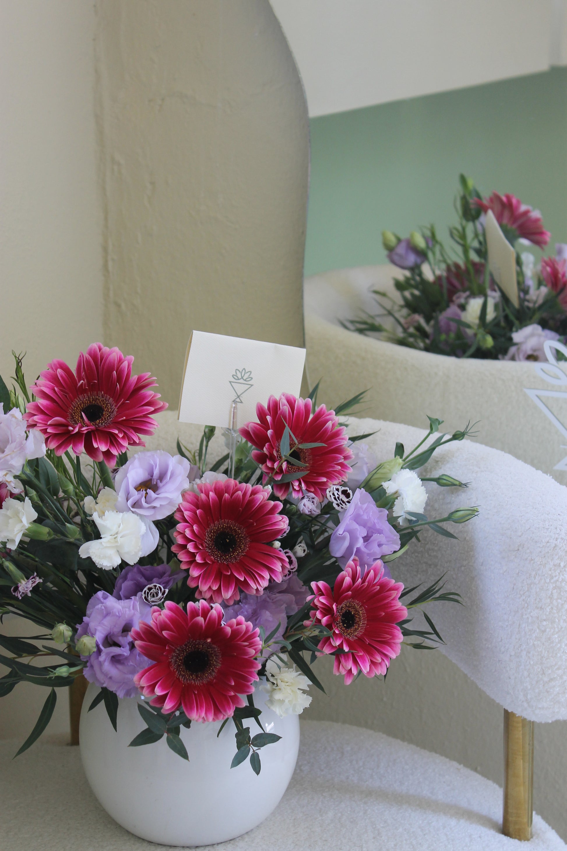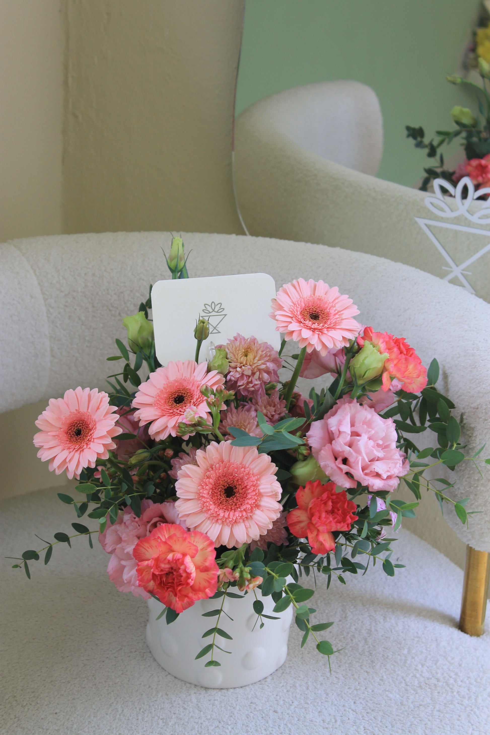 Arreglo garden style con 8 gerberas, claveles, alstroemerias, kalanchoe y follaje