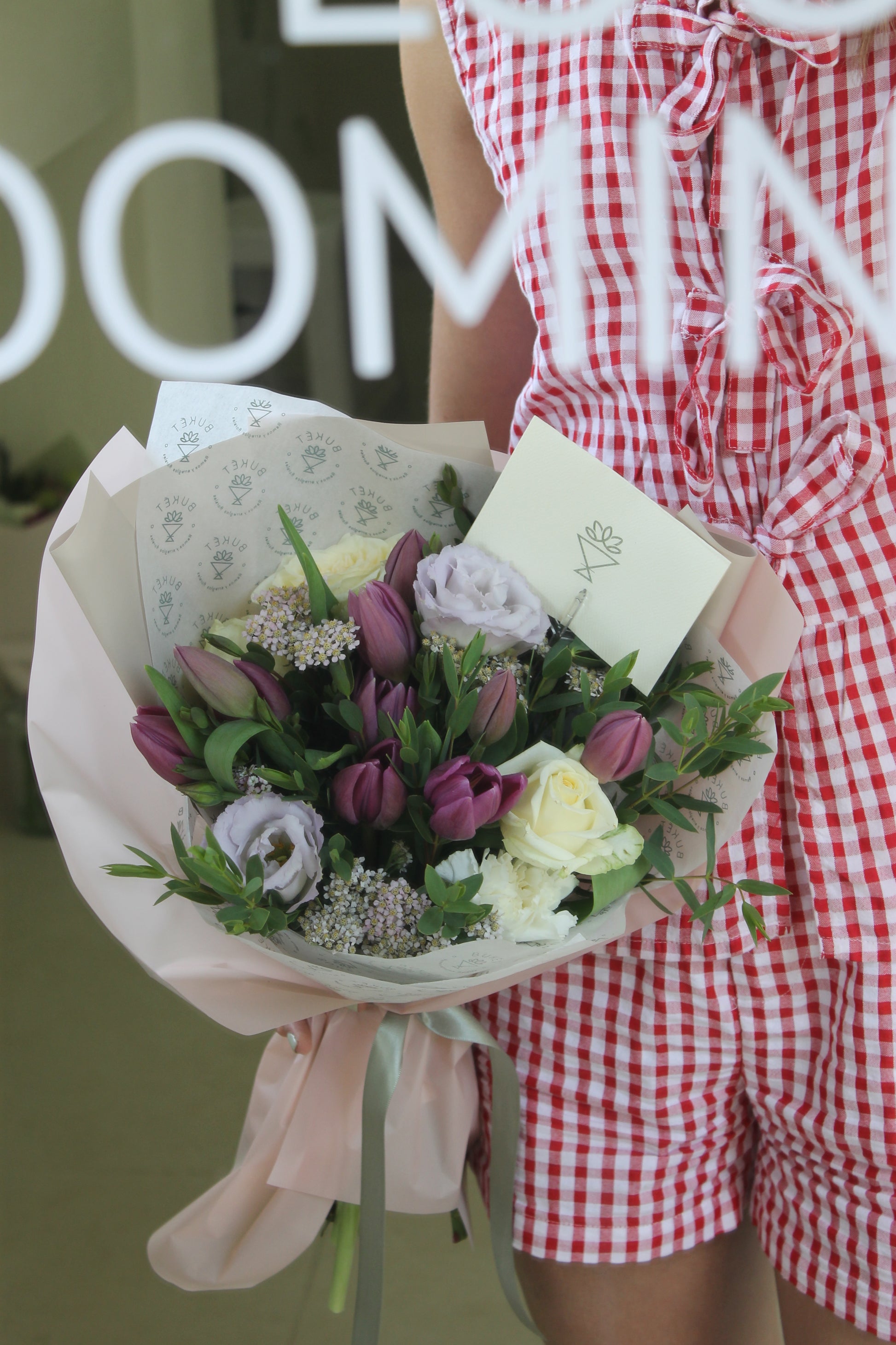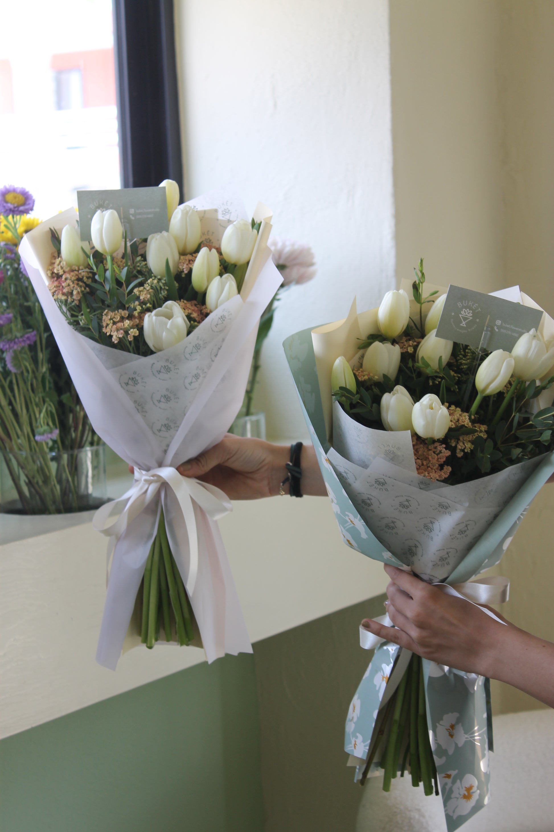 Ramo de 10 tulipanes en tu color favorito con follaje y flores complementarias (según disponibilidad) envueltos con papeles decorativos.