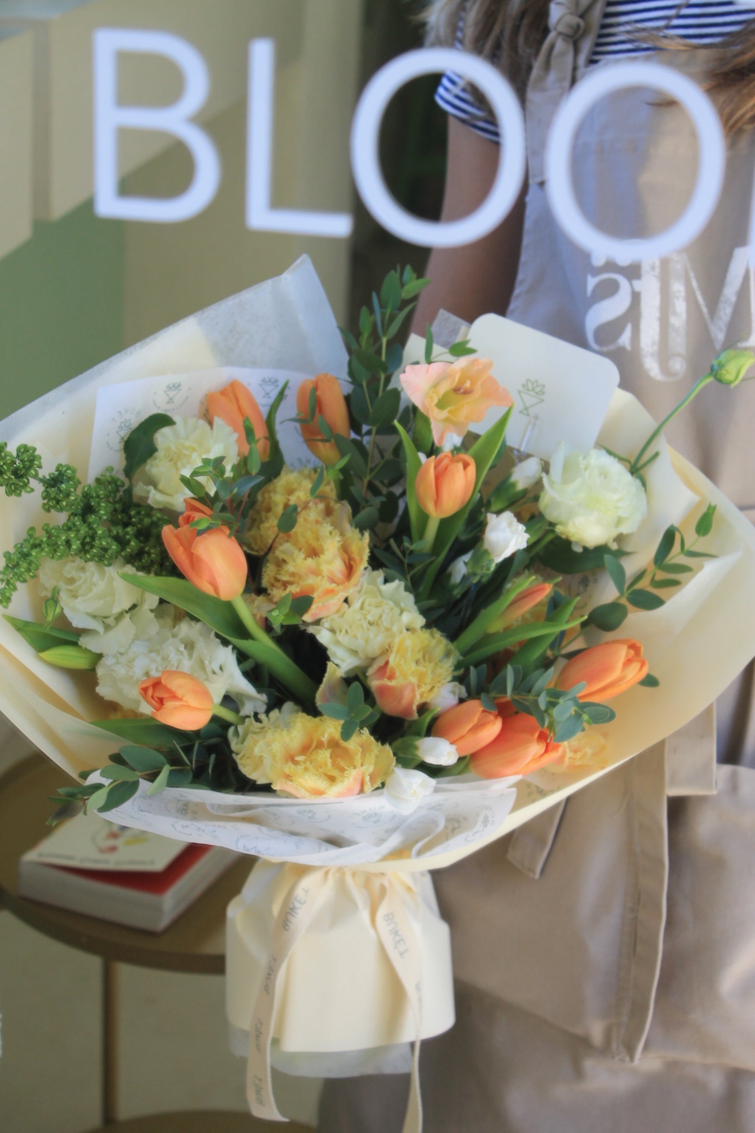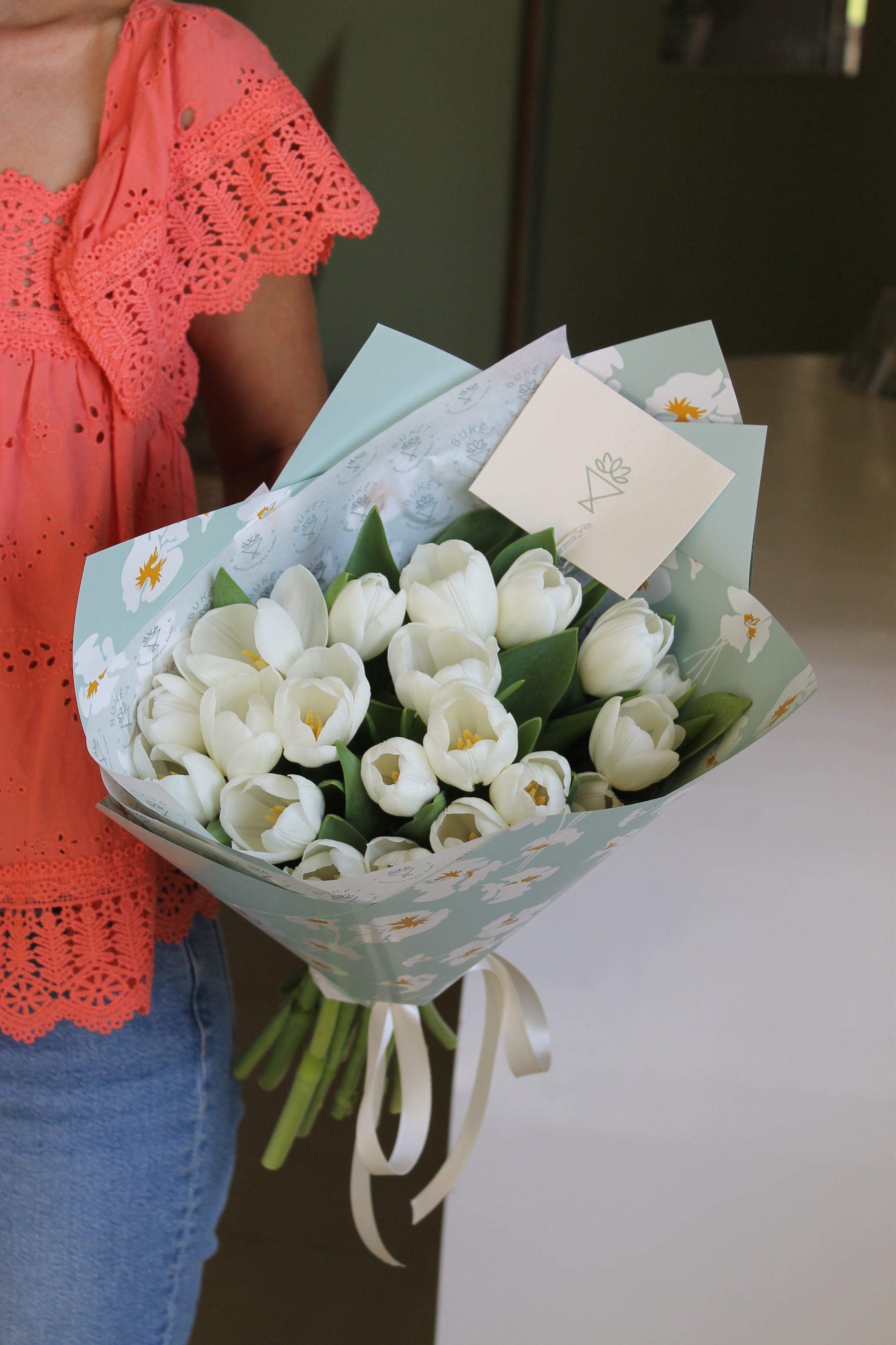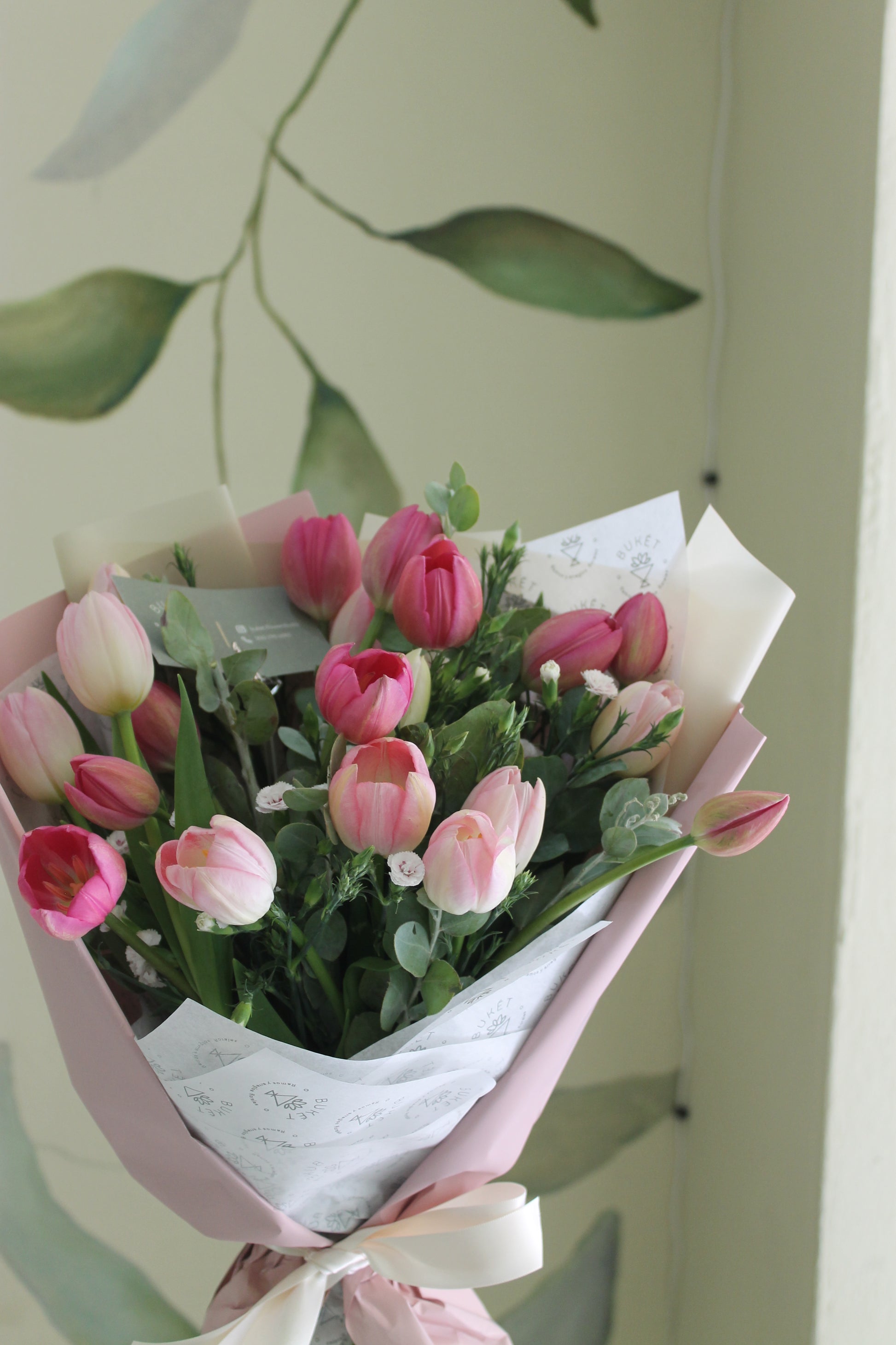 Ramo de 20 tulipanes en tu color favorito con follaje y flores complementarias (según disponibilidad) envueltos con papeles decorativos.