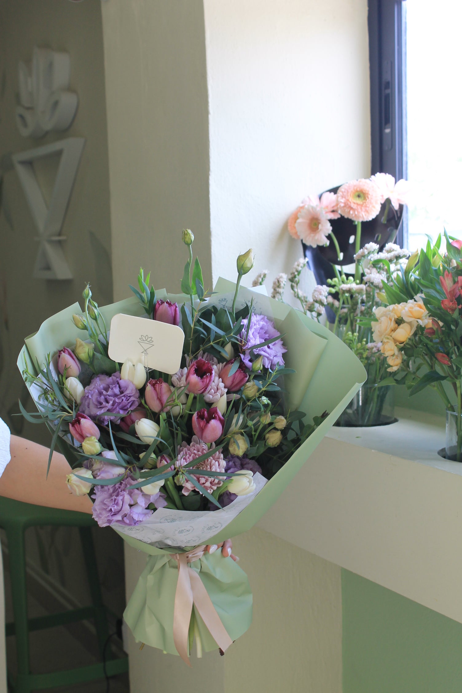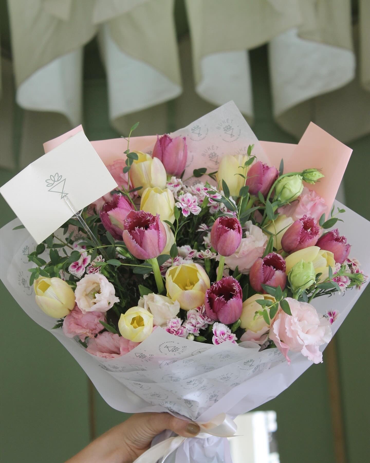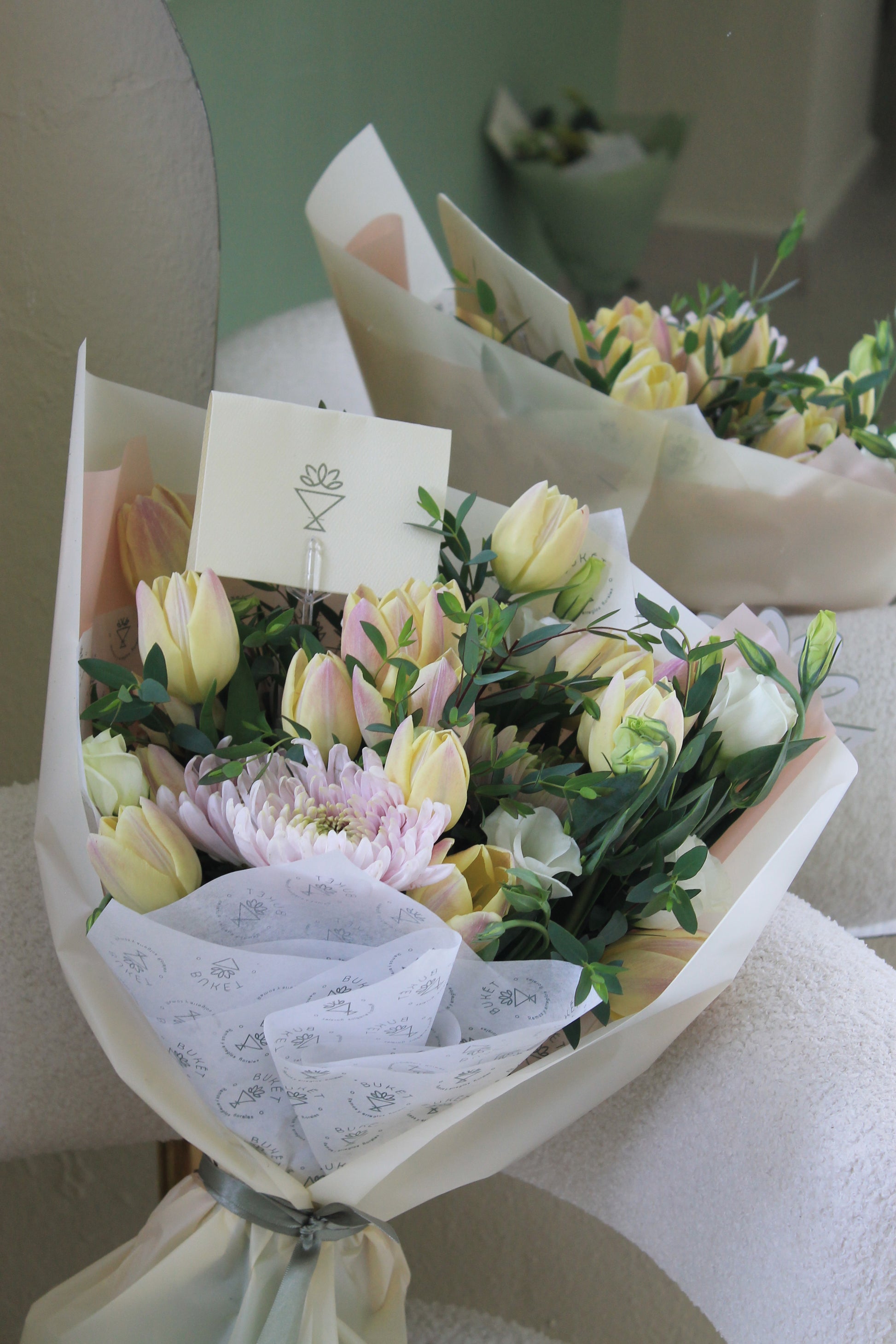 Ramo de 20 tulipanes en tu color favorito con follaje y flores complementarias (según disponibilidad) envueltos con papeles decorativos.