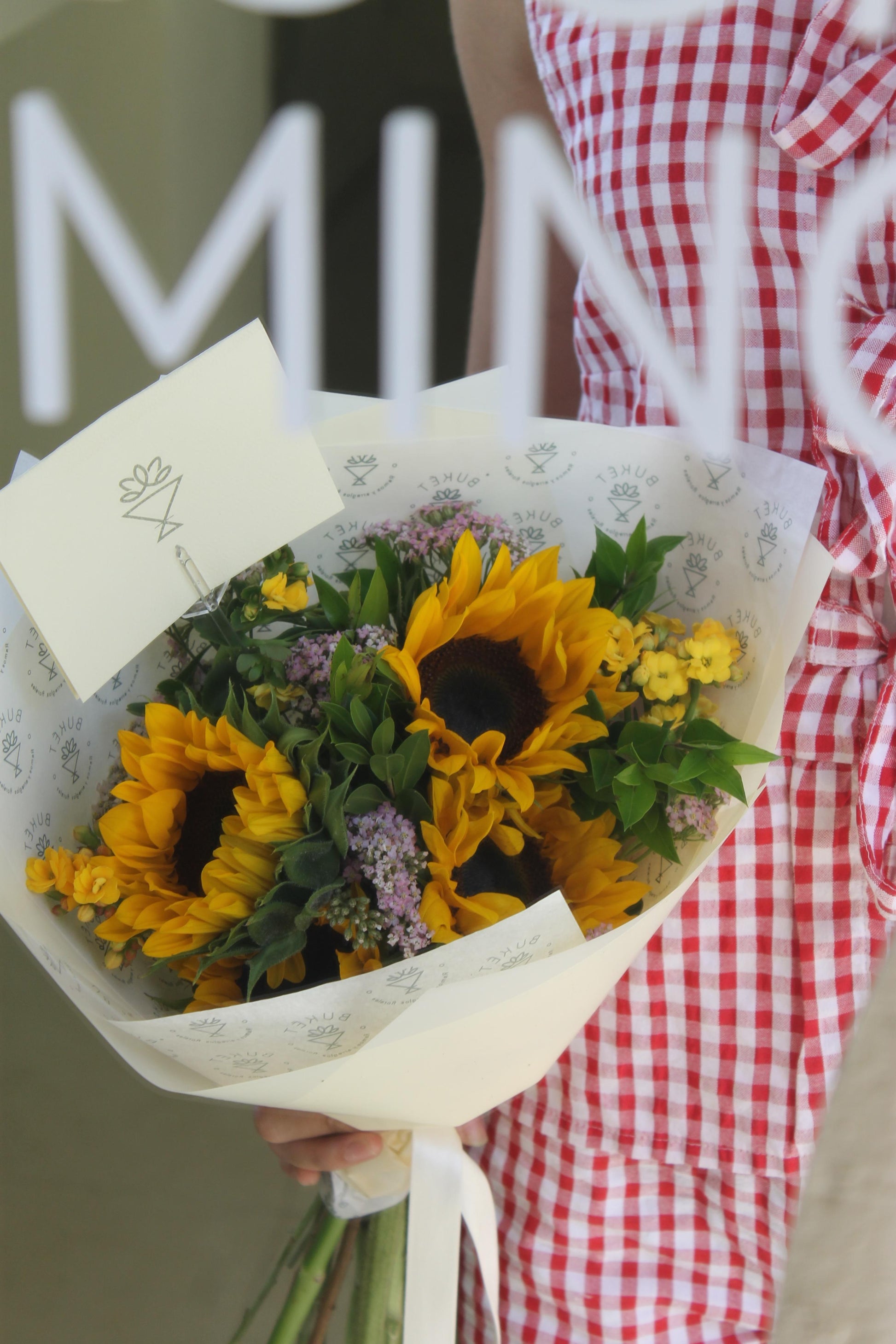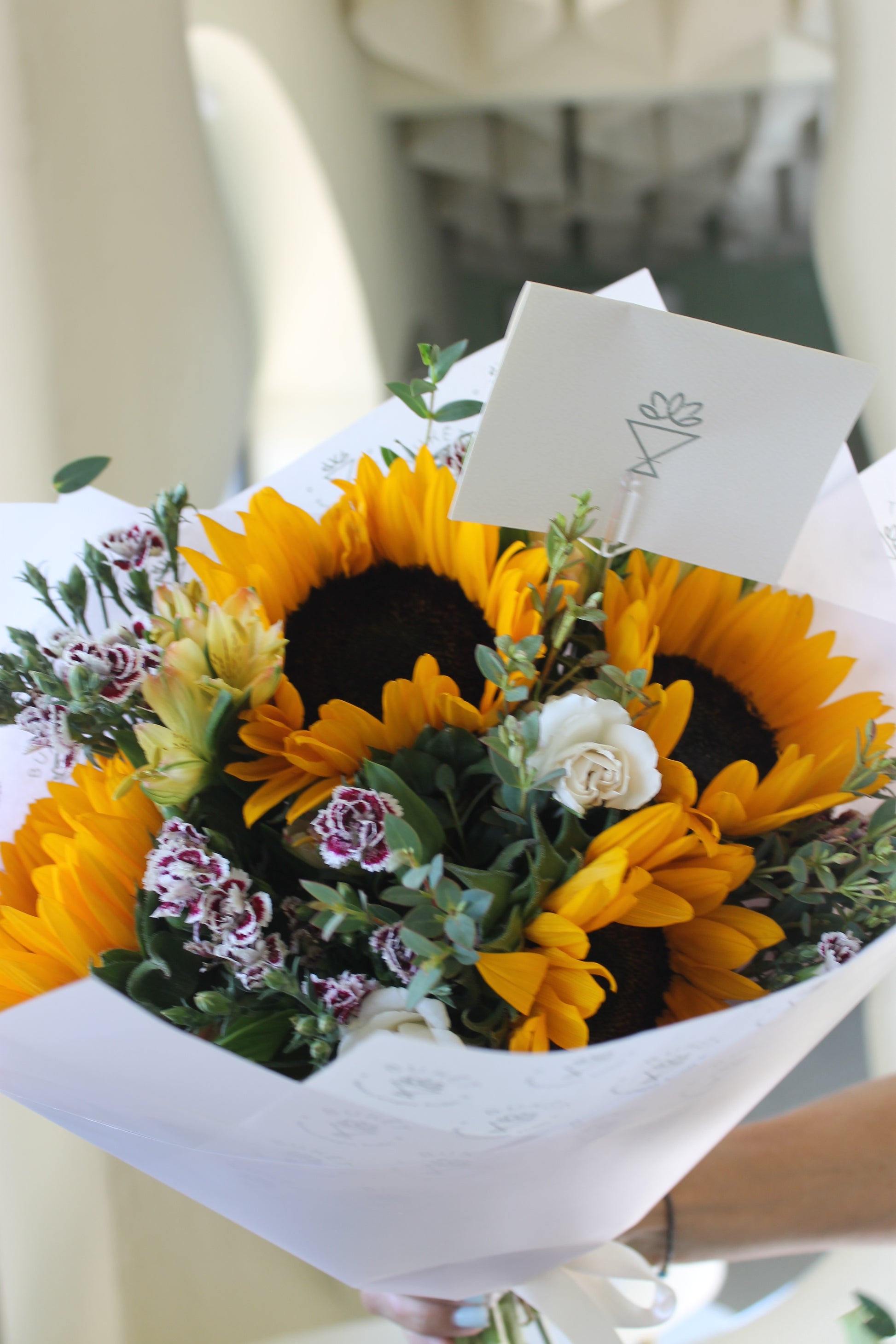 Ramo de 4 girasoles con follaje y flores complementarias (según disponibilidad) envueltos con papeles decorativos.