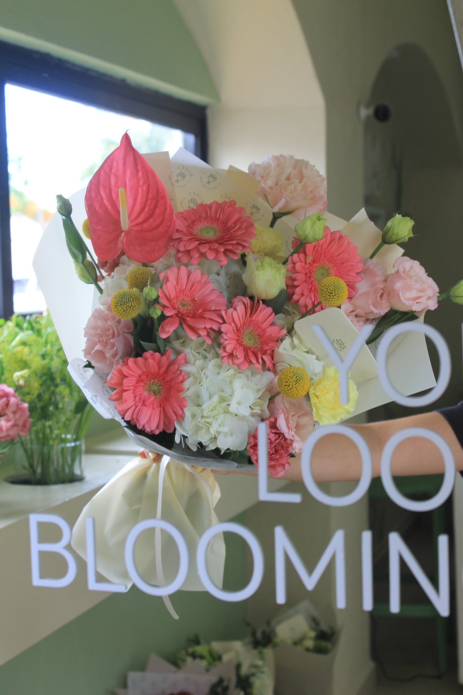 Ramo al estilo Bukét con una combinación de flores únicas (hortensias, gerberas, craspedias, anturio) para hacer sentir especial a una cumpleañera.