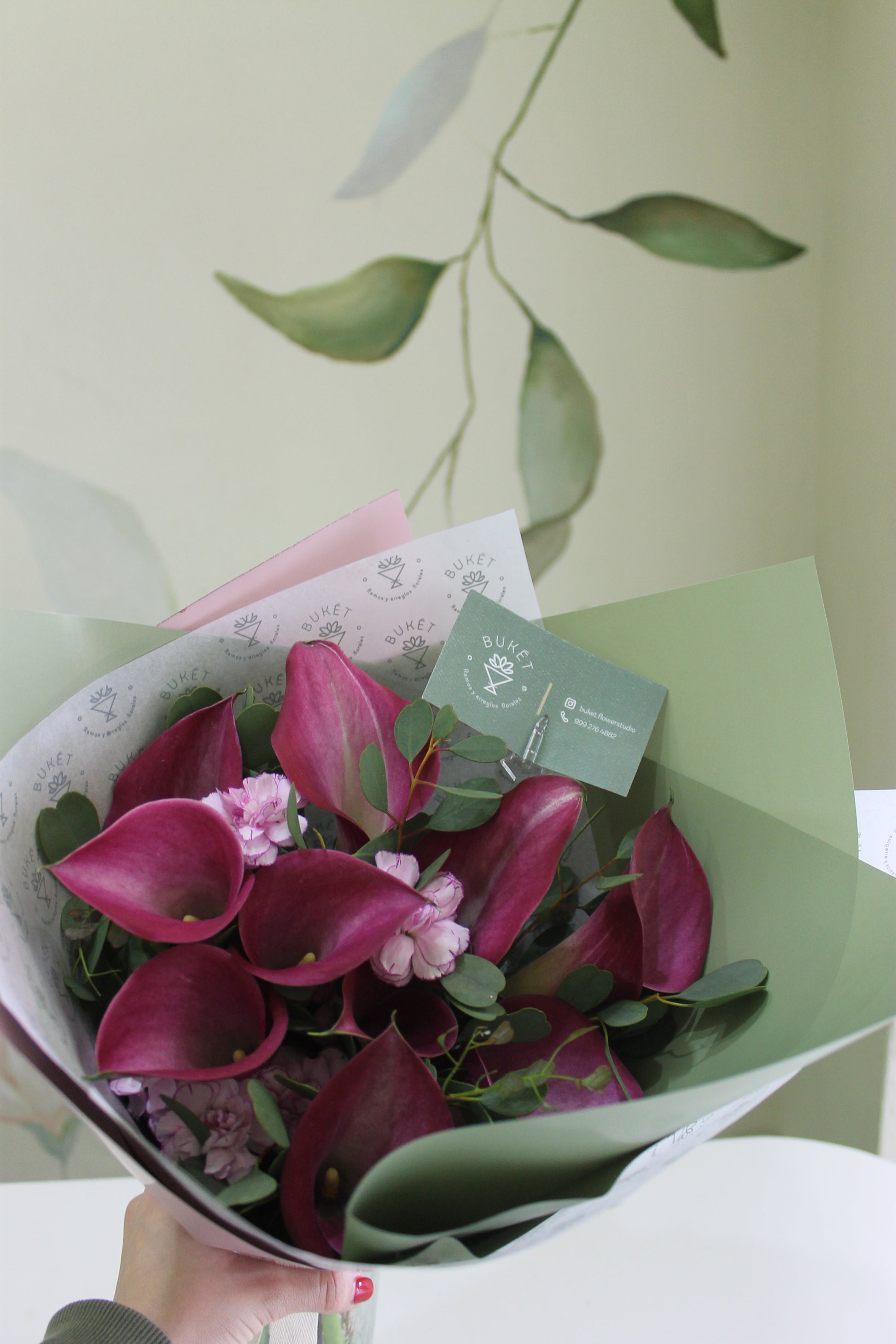 Ramo de 10 tallos de calla lilies en tu color favorito acompañados de follajes complementarios envuelto con papeles decorativos.