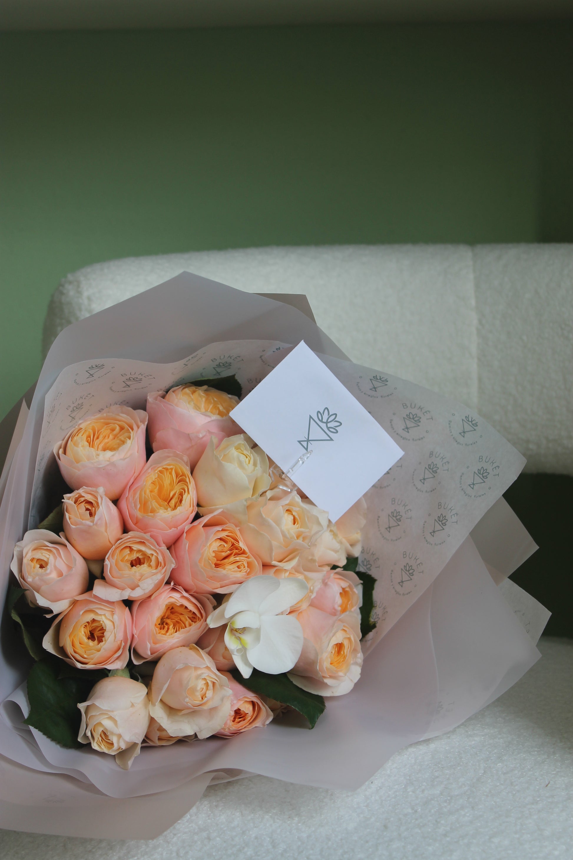 Ramo de 20 rosas inglesas con follaje y flores complementarias (según disponibilidad) envueltos con papeles decorativos.