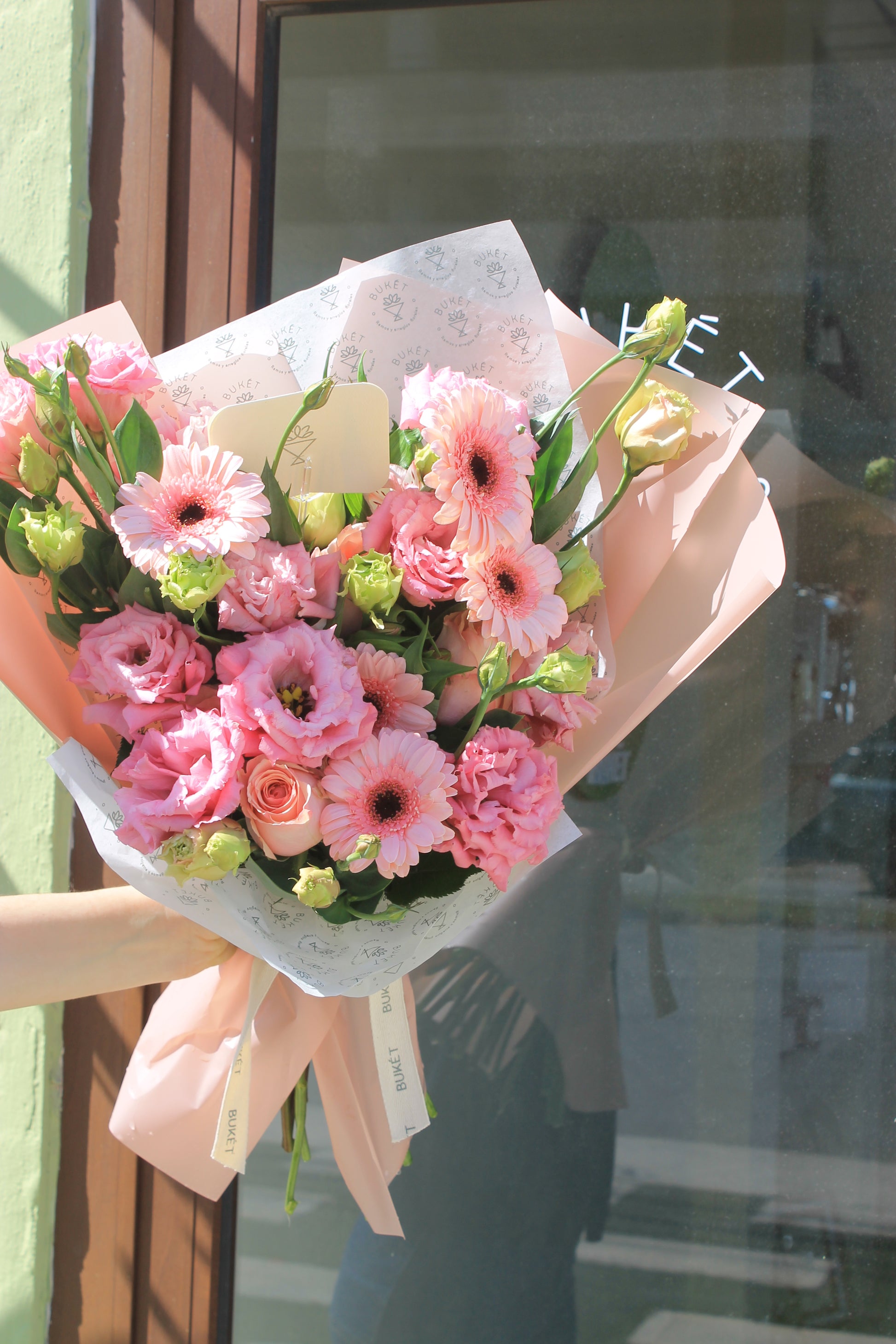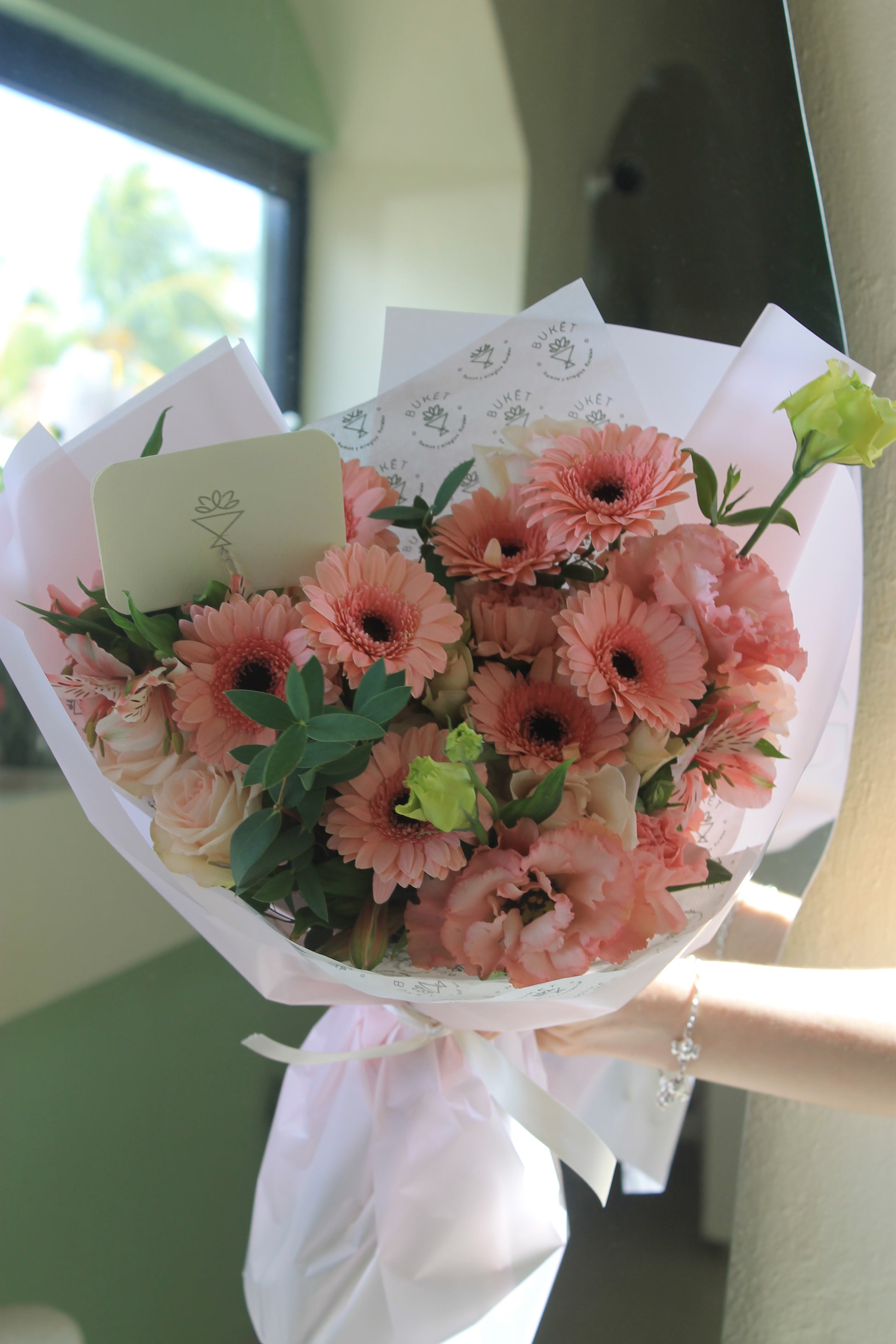 Combinación de rosas y mini gerberas con follajes y flores complementarias en tonos pasteles