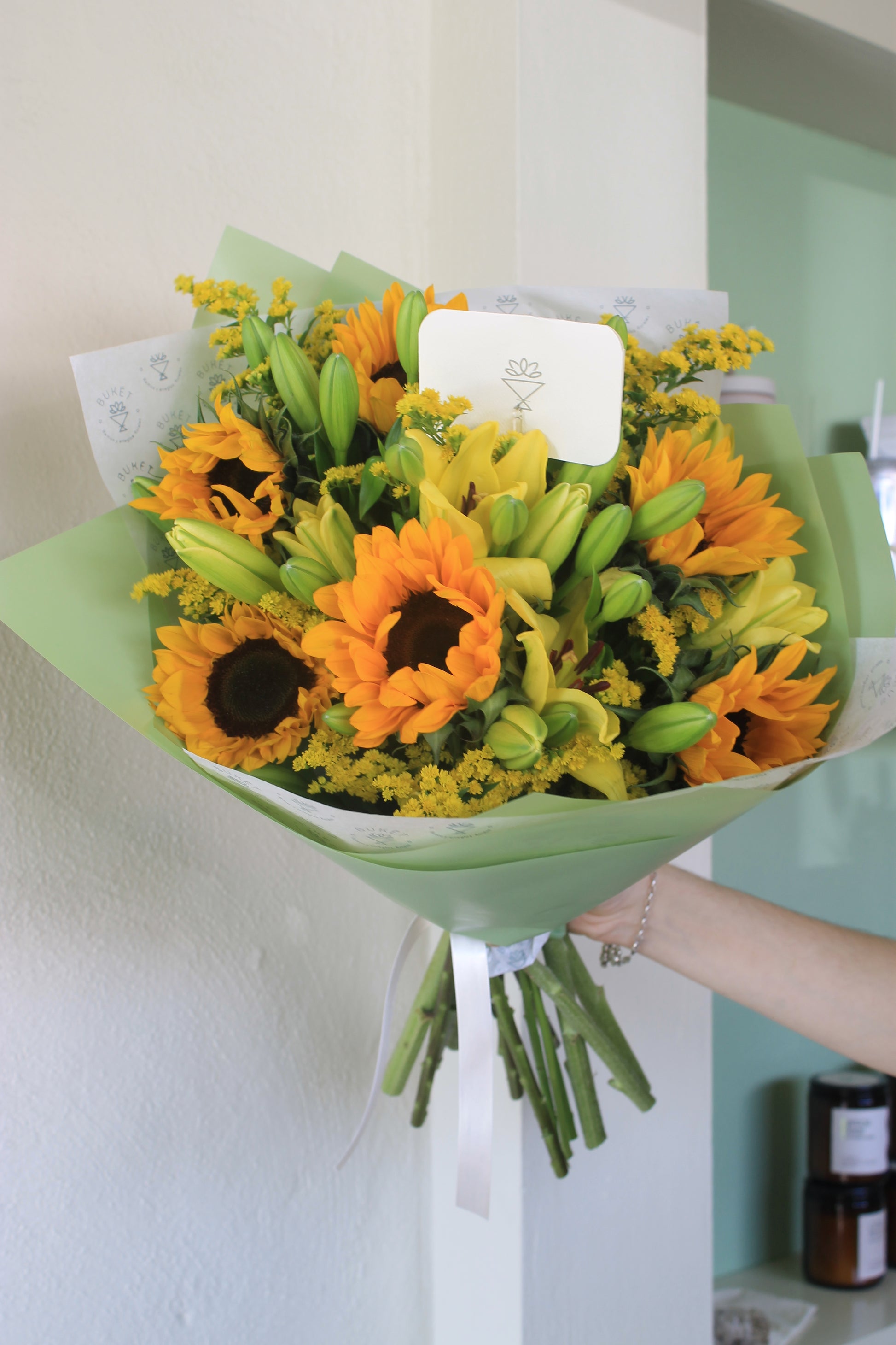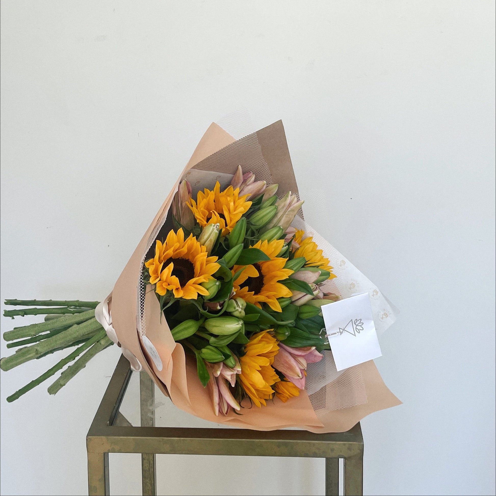 Ramo de 6 girasoles + 6 lilies acompañados de follaje (según disponibilidad) envueltos con papeles decorativos.