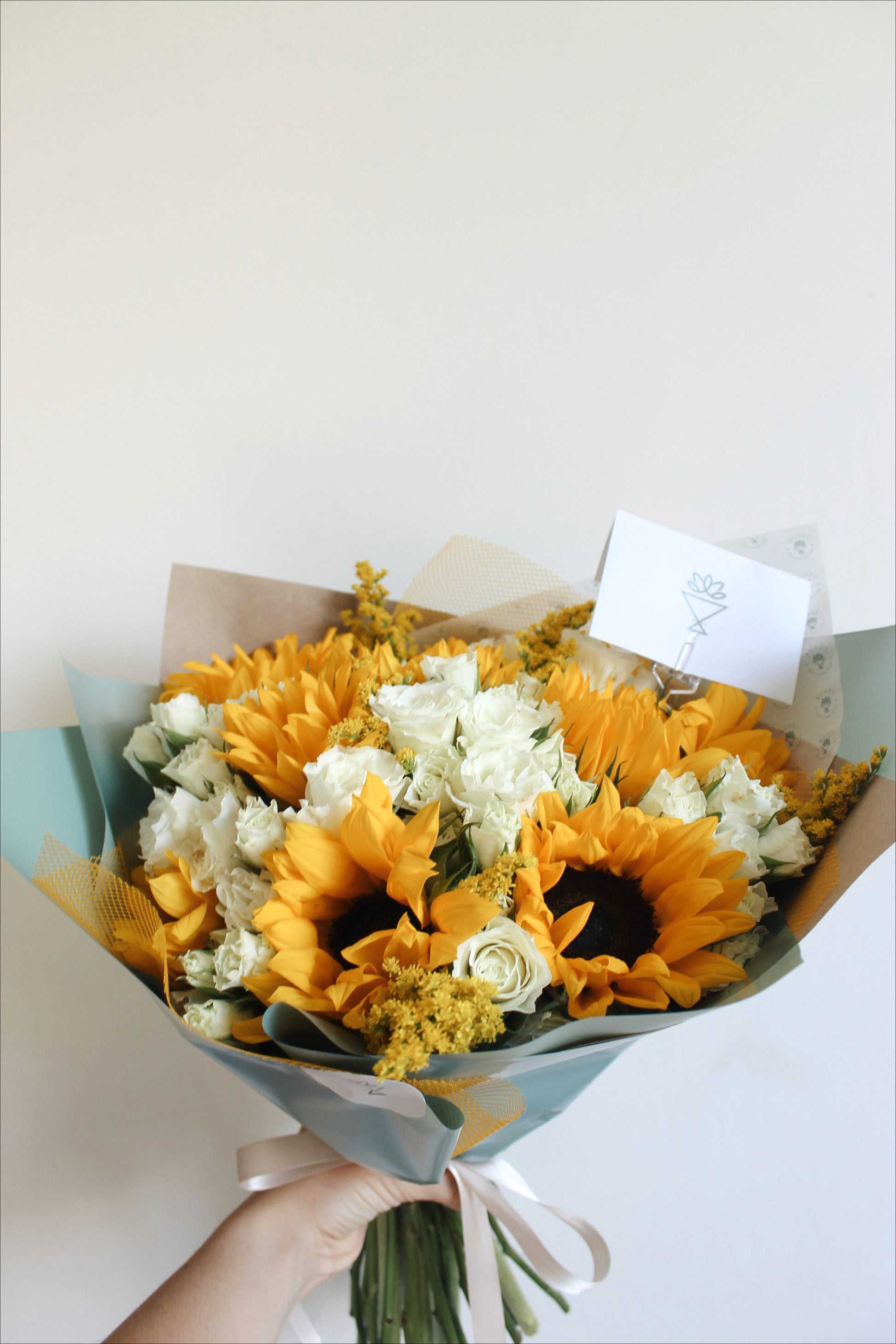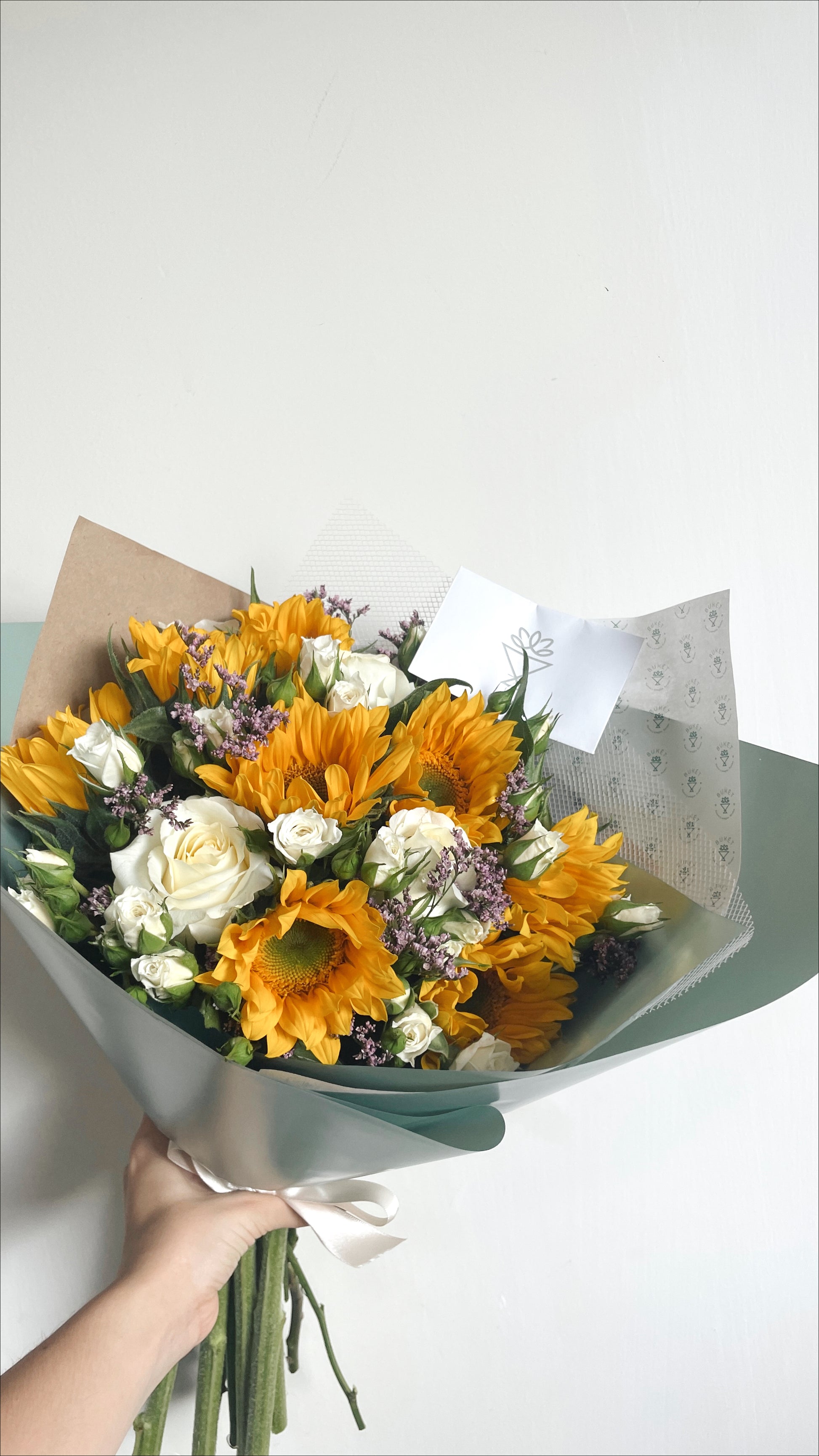 Ramo de 6 girasoles con mini rosas en tu color favorito acompañado de follaje y flores complementarias (según disponibilidad) envueltos con papeles decorativos.