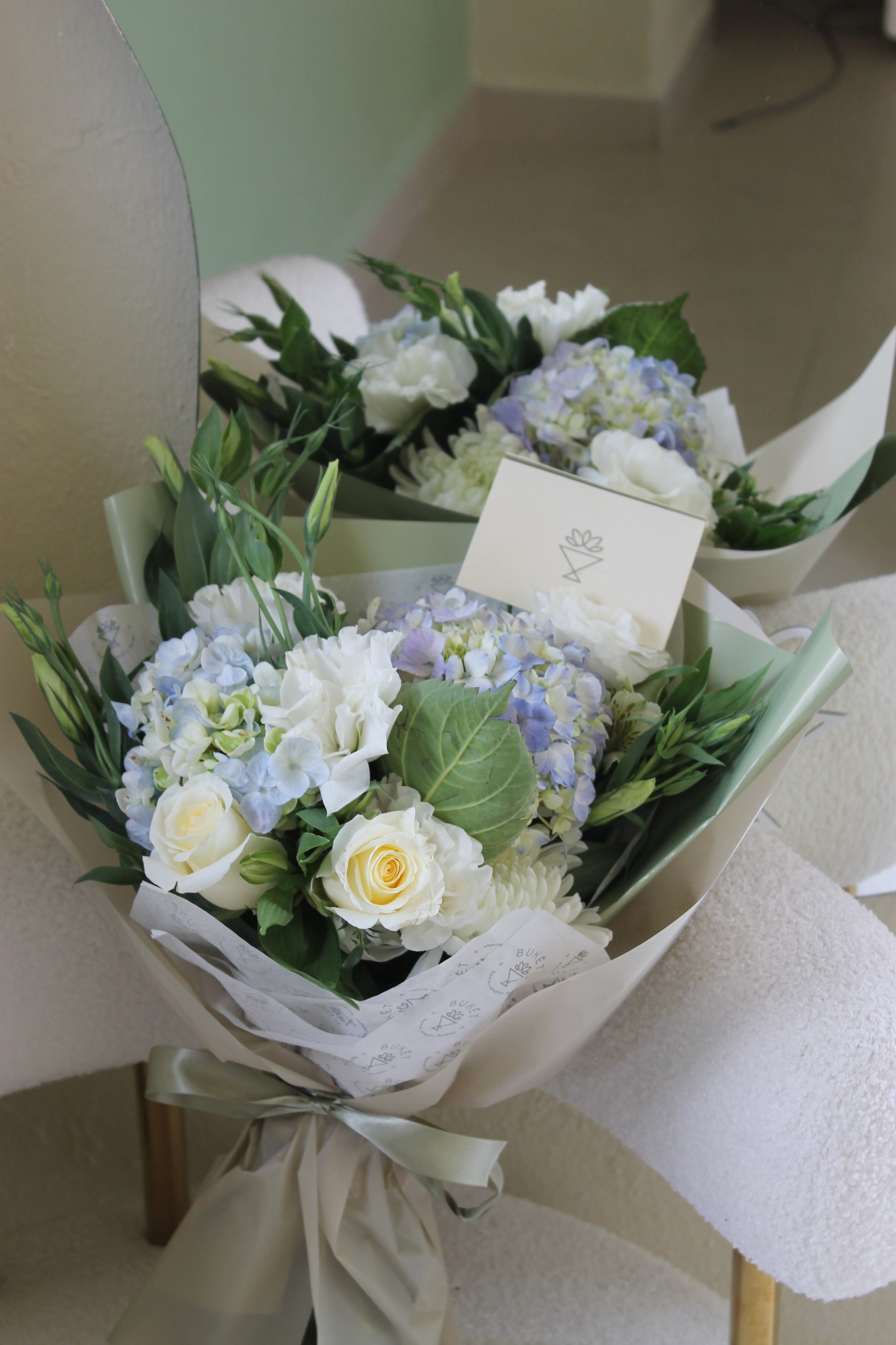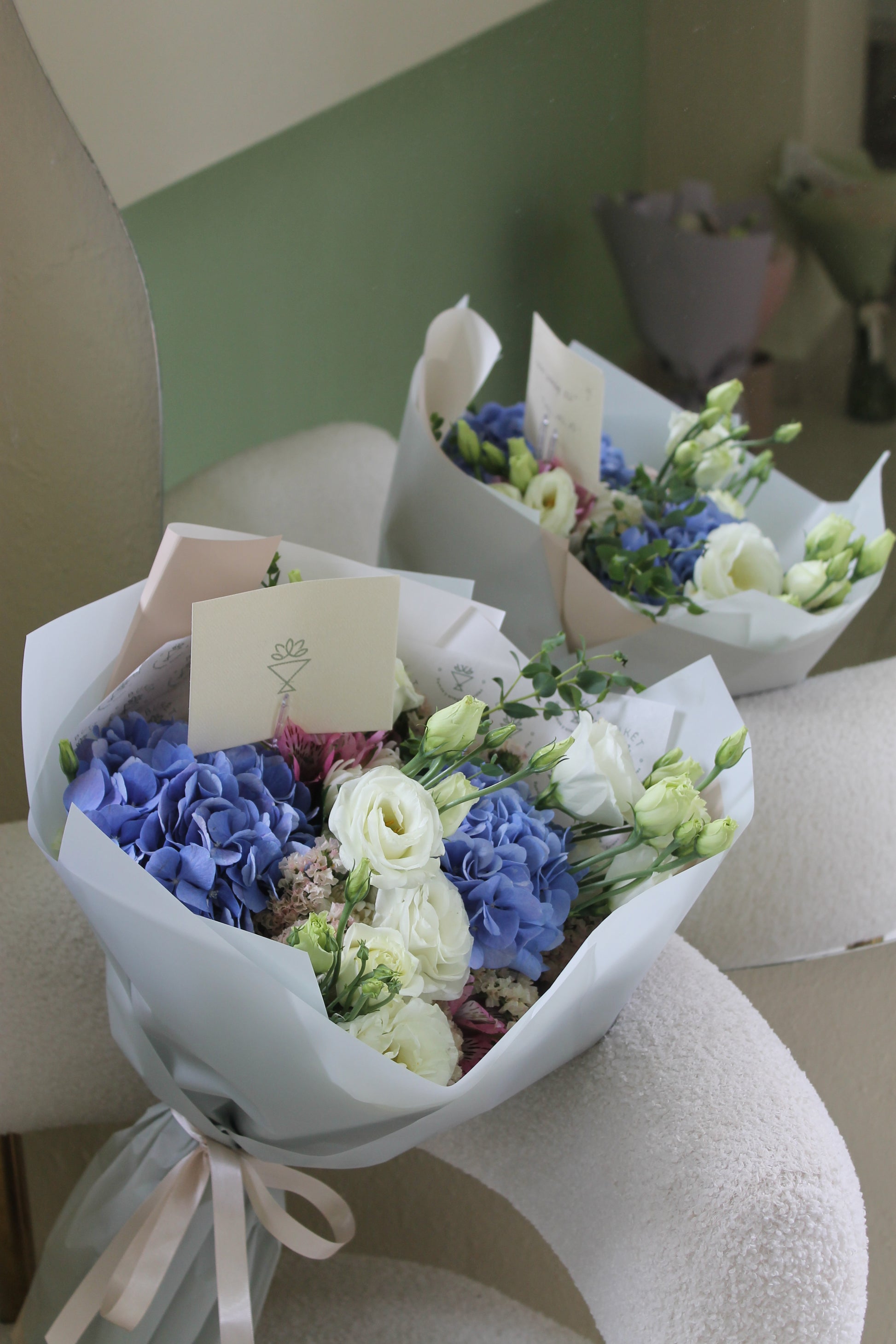 Ramo de 2 hortensias en tu color favorito acompañadas de flores complementarias y follaje (según disponibilidad) envuelto con papeles decorativos.