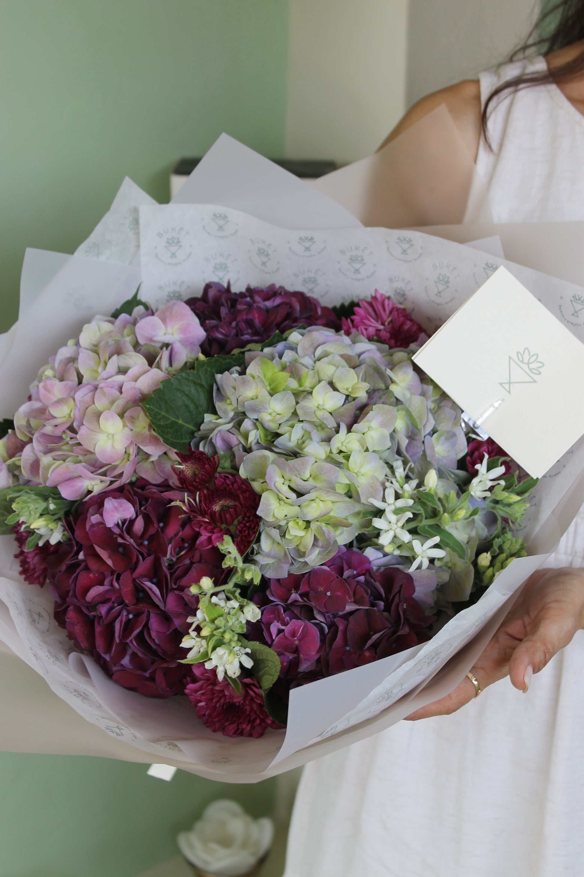 Ramo con 5 tallos de hortensia en tus colores favoritos envuelto con papeles decorativos.