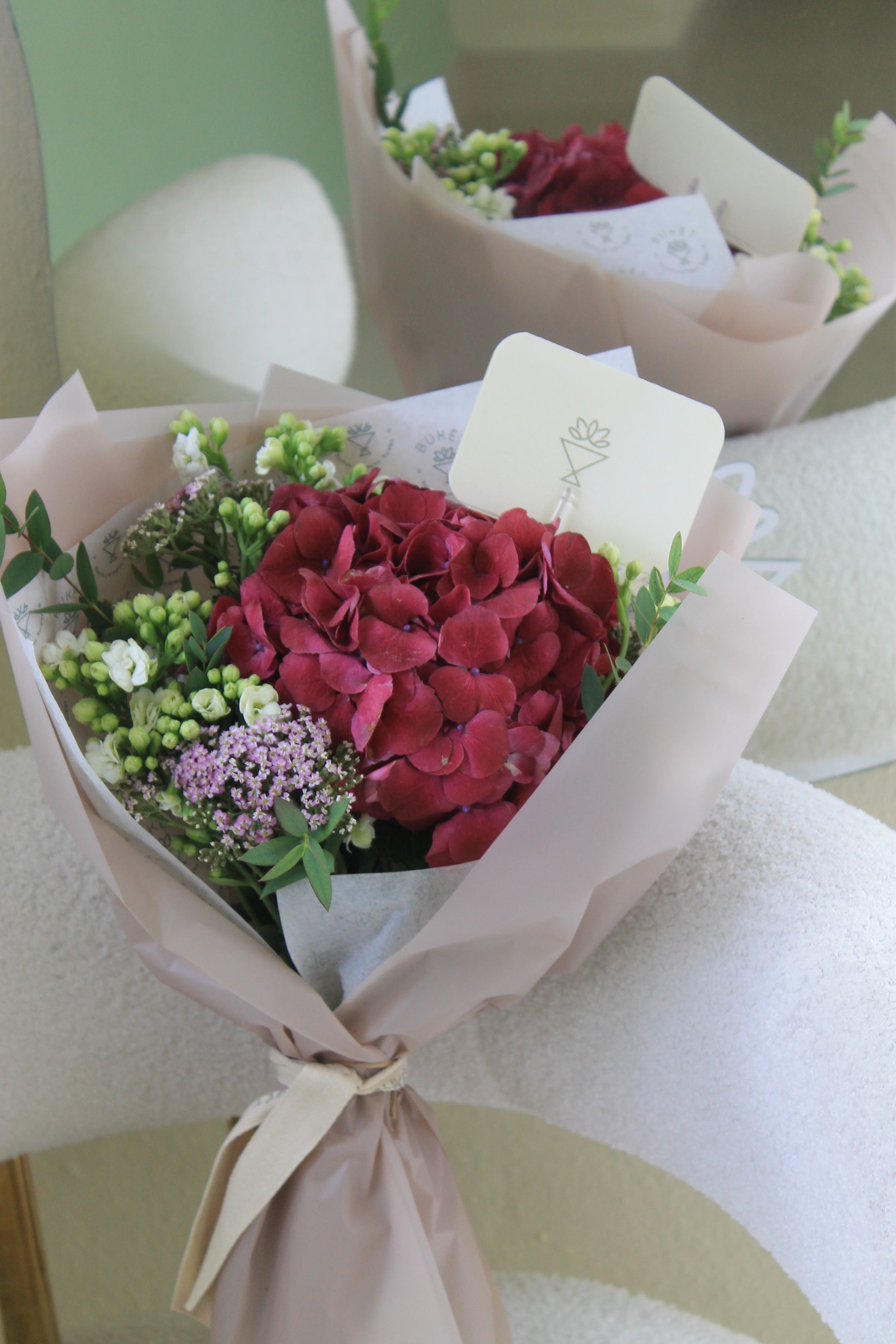 Ramo de 1 hortensia acompañada de follajes complementarios envuelto con papeles decorativos.